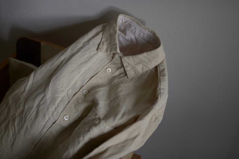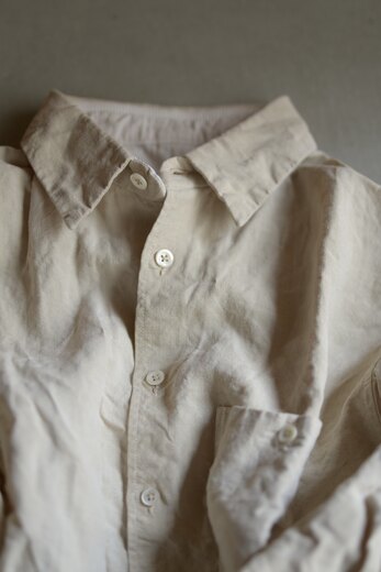 100年以上前のフランスにリネン。現代のものとは明らかに異なる何かを纏っている。不均一な織り、カリッとした触感、ずっしりとした重み。着込んだ先にある経年変化。それは格別なものがある。そんな生地をウォールナットをベースにした天然の染料で手染めしたシンプルなシャツ。無染色よりもより柔らかく、より温かみを感じる。手縫いとミシンを組み合わせ、とても丁寧に作られている。5年、10年経った時に本当の意味で自分のものになる。年齢を重ねる度、長く楽しめるシャツだと思う。