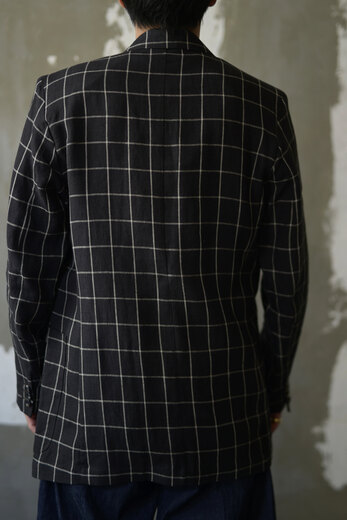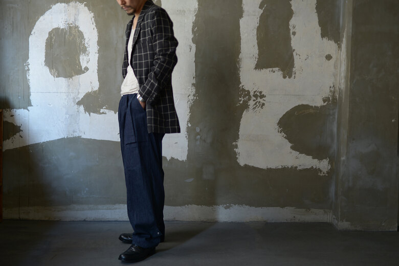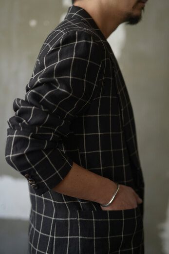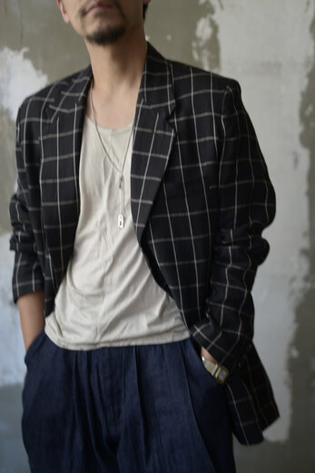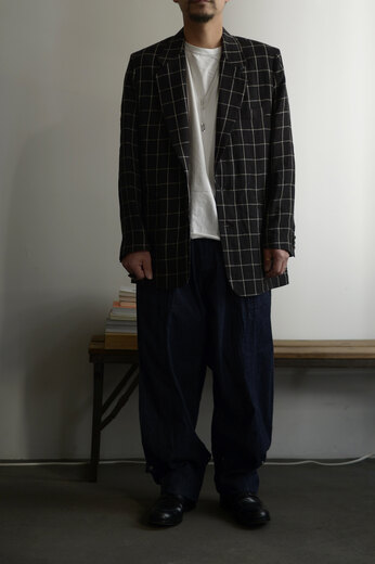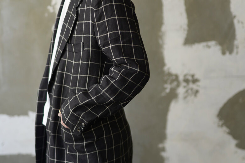 少し細長いジャケット、気分だなと思っていた時に出会ったHeron’s Ghyll。80年代後半から90年前半にかけて、ゴリゴリに肩パットが入った着丈の長いテーラードジャケット。当時そこまで長続きしなかった流行があり、あえてそこにフォーカスしているジャケットがどうしても気になった。低めのゴージと芯が入っていないラペルは1912年創業の老舗アイリッシュリネンメーカーのBAIRD McNUTTの生地との相性がよく、程よくリラックスした着心地だ。ちょっとボロボロのTシャツやタンクトップにワイドパンツ。スッと頭の中にイメージが湧いてきた。