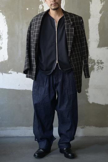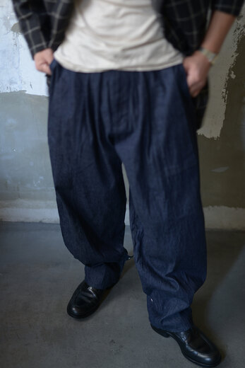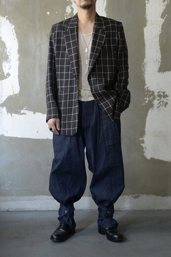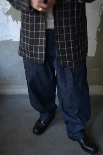 このパンツを穿いた時これめちゃくちゃ穿くやつだ!、と直感的に思った。インディゴデニムの表情が良かったのでデニム一択で選ぶ。ライトオンスで軽い穿き心地。見た目はミリタリーの様でもある。でも裾のスナップを留めるとニッカポッカみたいでワークと言っても良い。トップボタンはUS ARMYのボタン。悩みに悩んでデニムだし自分の中では労働着という事にしてみた。ジーパンみたいに。スナップボタンでちょっと変化も付けられる。でもやり過ぎていない。CLASSの洋服はやっぱり楽しい。