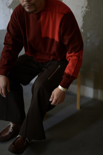 suzusanの前に別注したカシミアのカーディガンを手に取る。半年ぶりに触るけどやっぱり肌触りが段違いだ。出来るだけ素肌に触れたかったので、無地の白Tに合わすことにする。パンツはPROJECTbyH.のEROS。フェードした感じが好きだ。