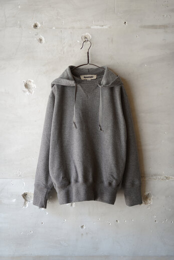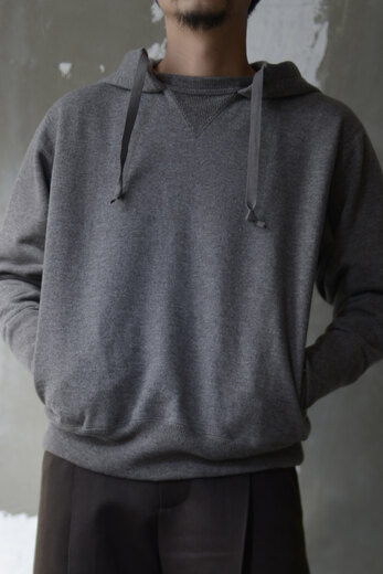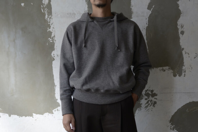 限界の限界の番手で編み立て、ずっしりとした重みに驚き、そしてこんなに目が詰まったスウェット生地は見た事が無かった。表裏ウォッシャブルの紡毛ウールを使った裏毛の素材で表と裏を繋ぐ糸にもウールを使った本当に100%ウールのスウェット。重みと厚み、着るとその重さはあまり感じない。形がしっかり出るので、キレイなシルエットだ。フードは肩が凝るので疎遠していたけど、後付けフーディなので軽くて気になることはなかった。洗濯できて、肘が出ず、ほぼ型崩れしない、そしてセーターのように暖かいスウェット。この冬もお世話になりそうです。