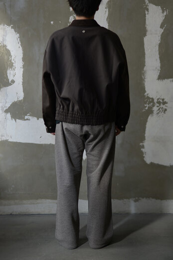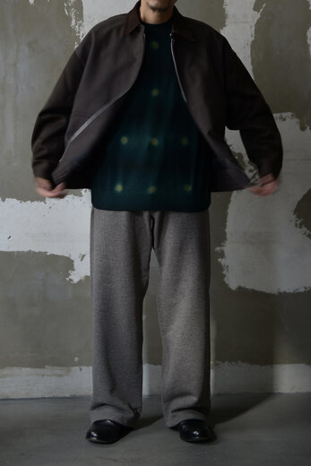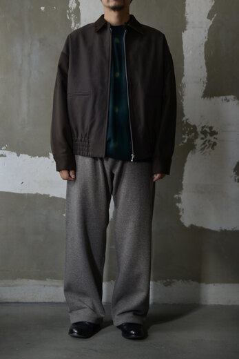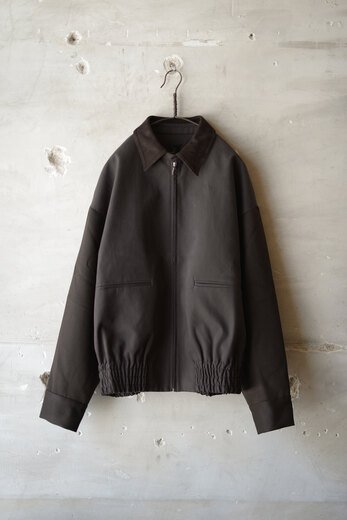 羽織る、ジップを上げる。その動作だけで全く違うものに見えた。初めは単純に格好良いと思ったし、短い丈は使い易いからと思って手に取る。羽織ってみると、ストンと落ちて綺麗に見える。ジップを上げると体と服の間に空間ができる。丸みを帯びるような。それは裾のゴムが強力でしっかり固定されるからだ。その感じが古いスウェットの雰囲気にも近いような気がして何だか気に入っていた。ボディはコットン、袖はウール。襟は何とも上品なラムレザー。同系色でまとめられているが、微妙にトーンが違う。でもまとまっている。このブルゾンは着るほどに奥深い。
