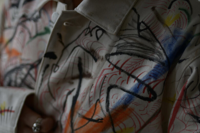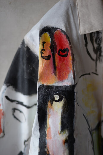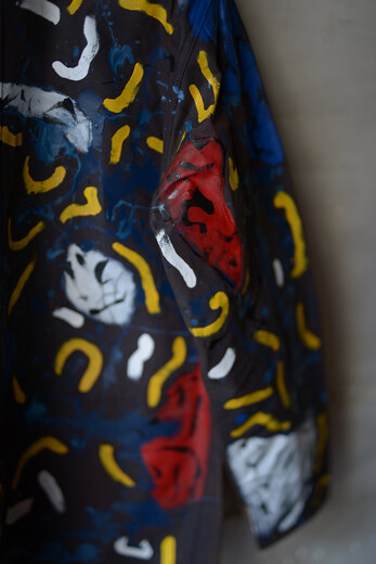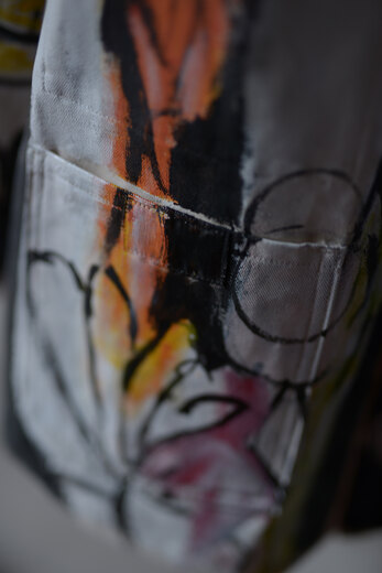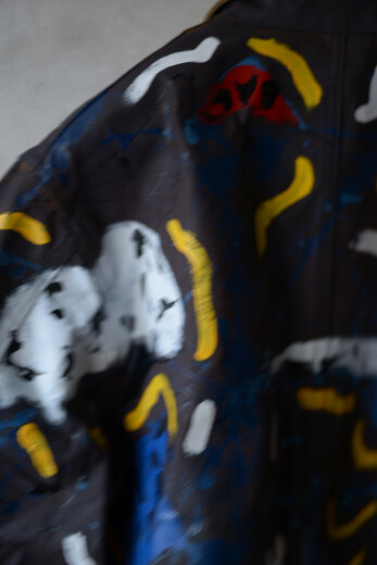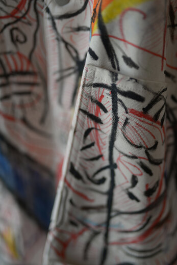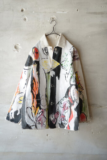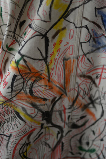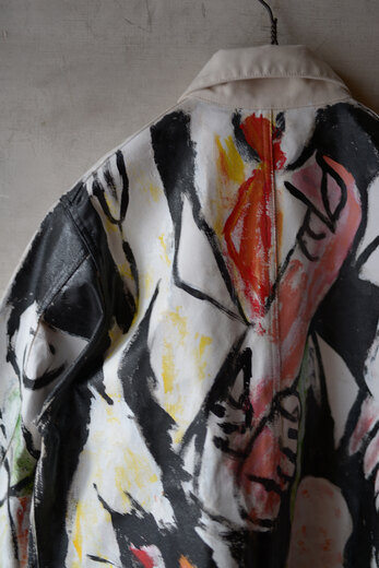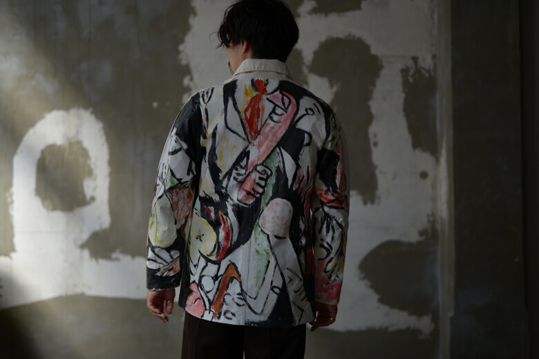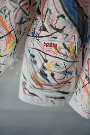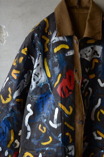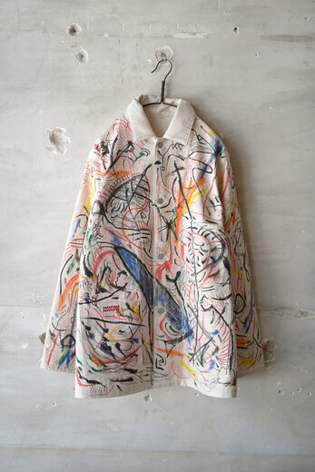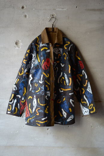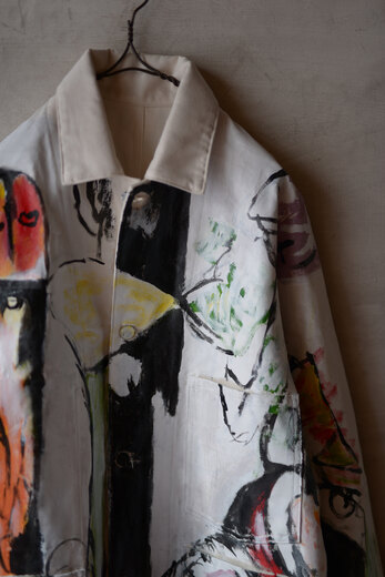 まるで感情を、頭の中をそのままカンヴァスに表現したように感じました。地図に見えるという人もいたり、公園?という人もいました。人によって感じ方や受け取り方が違う。さまざまな事を想像できる作品だと思います。他の2着とは異なり、柔らかく初めから着やすいカバーオール。ちょうど入荷したてのrenomaみたいな柔らかいスラックスと組み合わせると良いかもしれません。世界に一つだけの特別な洋服を着用でき、その空間にあるだけでも空気が変わる。そんな贅沢で楽しいカバーオール。