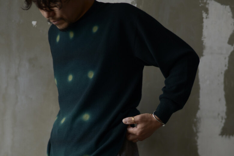 顔をうずめたくなるほど柔らかな肌触り。出来るだけ素肌に触れていたいと思えるsuzusanオリジナルの内モンゴル産の上質なカシミア。偶然が重なり、毛玉が出来にくい生地になったそう。まるで蛍の光のように見えるホタル絞りという技法で染められている。綿を縫い付けた状態で染める事で中心は染まらず外に向かって少しずつぼやけていく。その色のぼやけがとても美しい。カシミアは着て、洗って、ブラッシングして。それを繰り返し長く使えば使うほど気持ち良くなる。そして愛着も湧いてくる。寒い時期にしか着れない洋服。それはとても特別に感じます。