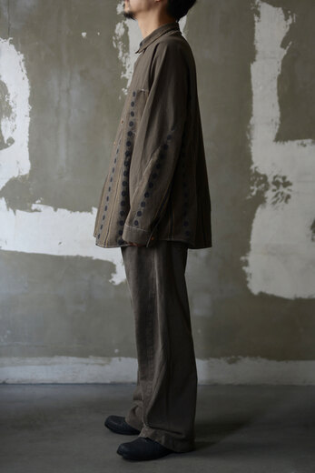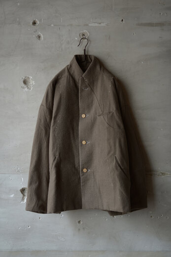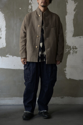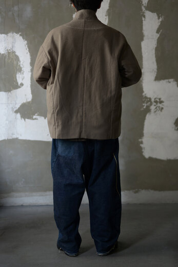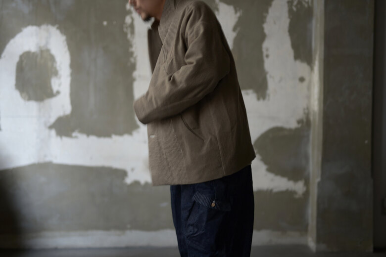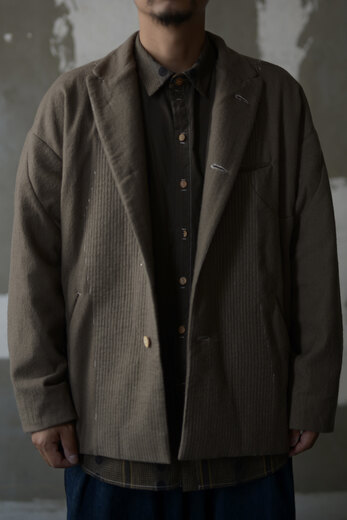カバーオールのようでもありテーラードジャケットのようでもあり、もはやコートと言っても良い。それぞれの個性が融合したORDINE。少し丸みがあって軽く、優しく包まれるような着心地。身幅がたっぷりなので、寒くなればセーターを着てもモコモコしにくい。螺旋を描くパターンなのに、ここまでまとめられる技術の高さとデザインは本当に素晴らしいと思う。表地はガーゼのようなウール、裏地は高密なコットン。丁寧にしっかりと作られている。表に無数に走るステッチは接着を使いたくなかったからだそう。そのステッチさえも一つのデザインとして成立している。PROJECTbyH.の手仕事を感じられる洋服です。
