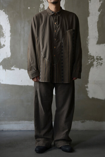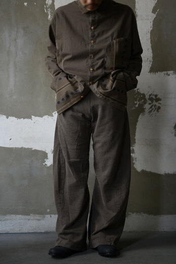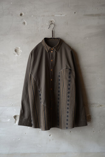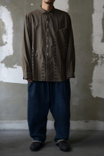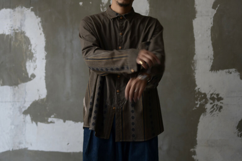 ここ最近このデザインが気に入っています。至極複雑なパターンなのに着心地が楽で、ゆったりと気分の良いシャツであるPOMPEII。今回はアトリエにストックしている生地の中からお任せで製作をお願いする事にしました。生地を変えるとこのシャツの全貌が視覚的にわかりやすいのでは?と、ある意味好奇心もありました。そして届いて箱を開けると、無意識に『わー!』と声が出ました。柔らかく優しいコットンとドットとストライプ、セルヴィッチのあるコットン。個性的な異素材の組み合わせ。でも凄くまとまりがありPOMPEIIの良さが表現されていると感じました。サイズを下げるといつものシャツのようで、上げると羽織のようなコートのような。あまりサイズの概念もありません。その時の気分で、選んでみて下さい。