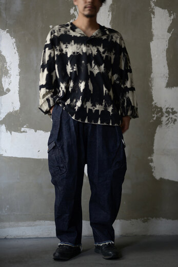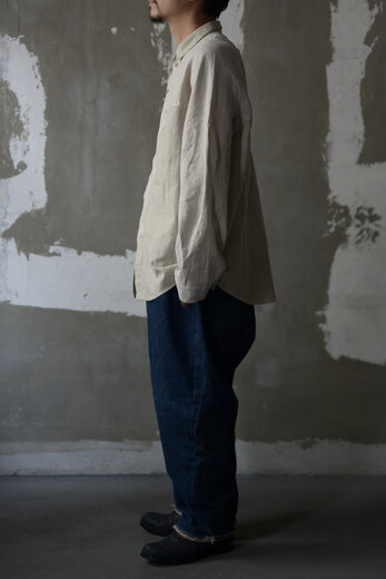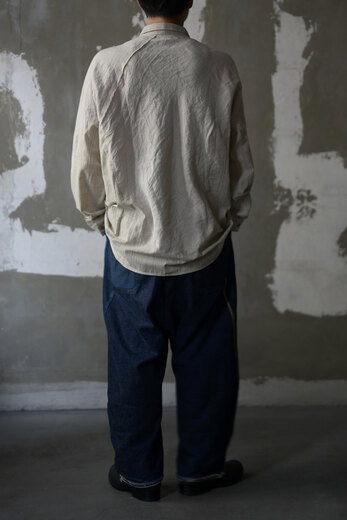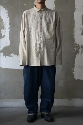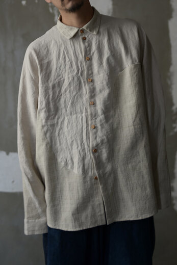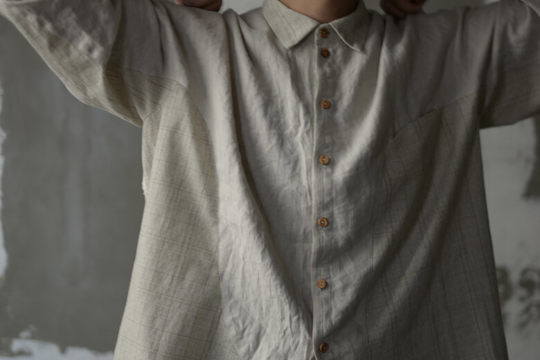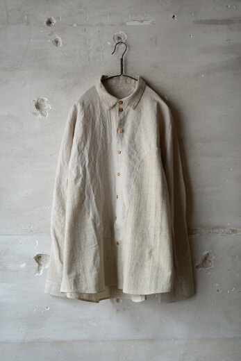 ここ最近このデザインが気に入っています。至極複雑なパターンなのに着心地が楽で、ゆったりと気分の良いシャツであるPOMPEII。今回はアトリエにストックしている生地の中からお任せで製作をお願いする事にしました。生地を変えるとこのシャツの全貌が視覚的にわかりやすいのでは?と、ある意味好奇心もありました。そして届いて箱を開けると、無意識に『わー!』と声が出ました。肌触りの良いリネンと雰囲気のあるチャック柄のコットン。個性的な異素材の組み合わせ。でも凄くまとまりがありPOMPEIIの良さが表現されていると感じました。サイズを下げるといつものシャツのようで、上げると羽織のようなコートのような。あまりサイズの概念もありません。その時の気分で、選んでみて下さい。