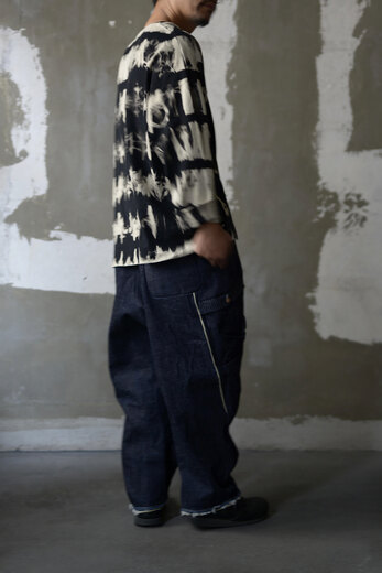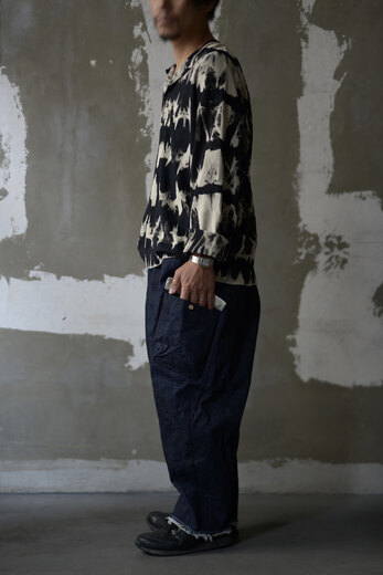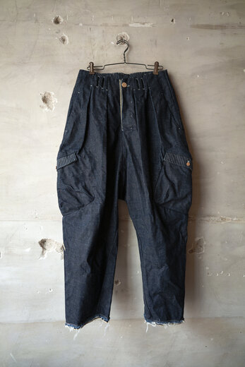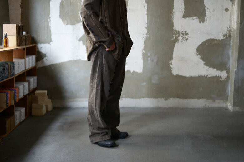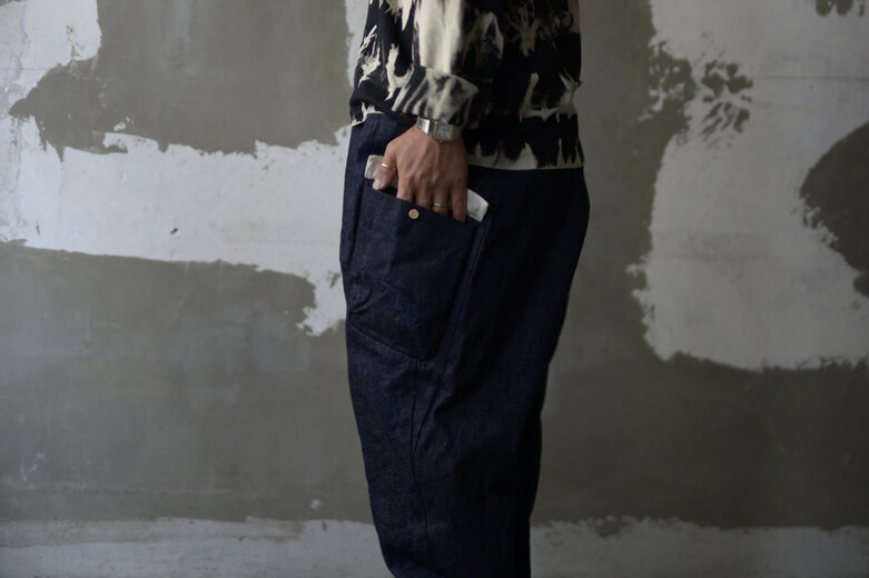 定番であるEROSの新型は少しパターンを調整したのとカーゴポケットが付きました。これがなかなか使い易く、座っている時や自転車に乗っている時に出し入れしやすい。実はコレクションではデニムでは展開していませんでした。イベントの時にデニムでオーダーくださった方がおられまして。絶対に良いだろうと思って店頭分としても作ってもらいました。14オンスのセルヴィッチデニム。初めはハリが強いですが、何度も穿いていると体に馴染んできます。ワイドで動きやすく、他にはない立体的なパターンやデザインと空気。個性。さりげなく個性が出せるパンツです。