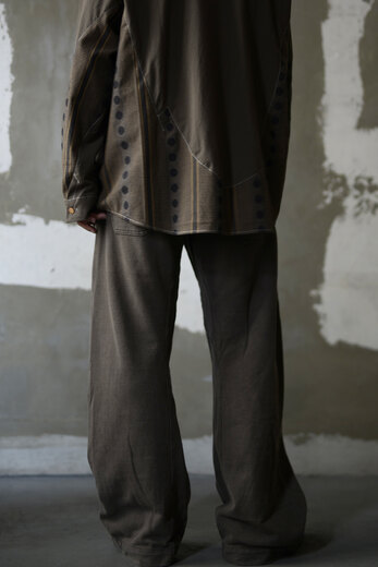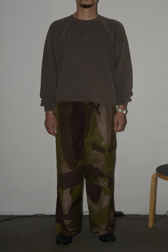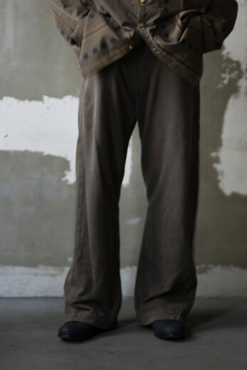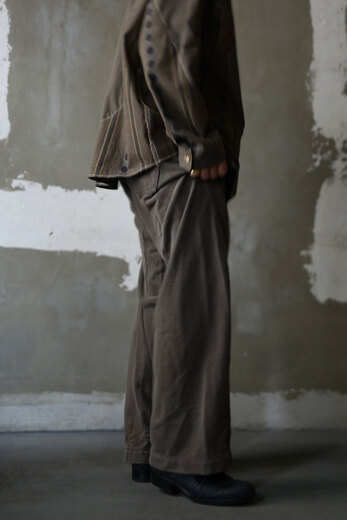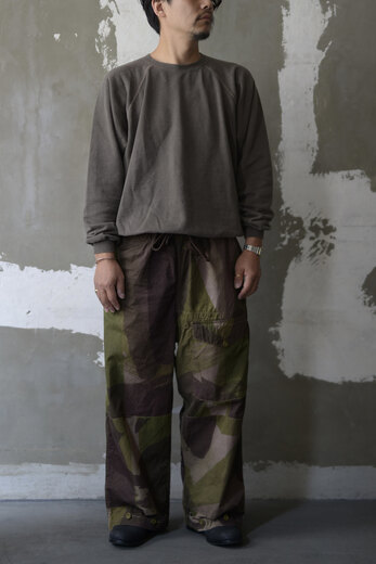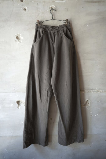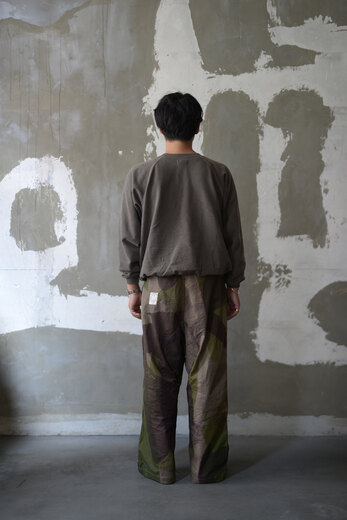 デザインを変えながら継続して展開しているスウェットパンツ。スウェットシャツと同じヴィンテージを思わせる長年着古してフェードした色。スウェットパンツという身近な洋服だからこそ、見えない部分のテクニックや拘りを感じやすい。斜行したデザインに腰履きに見える少し下目に付いたバックポケット。ダルっと、ユルっとした雰囲気が何とも格好良い。ジャケットやシャツと組み合わせて。メインになれるスウェットパンツ。