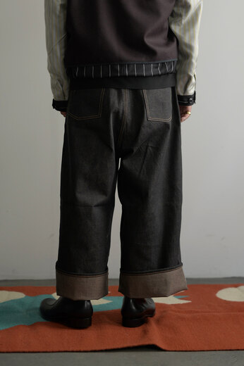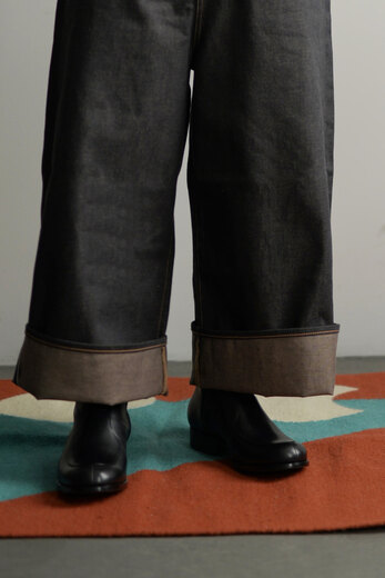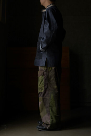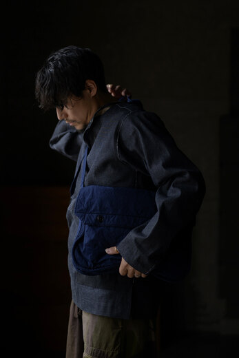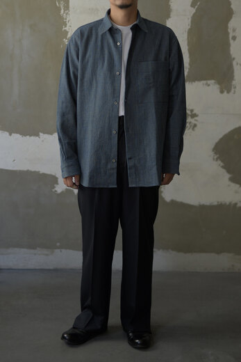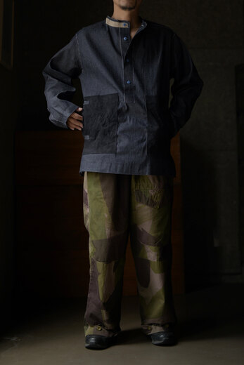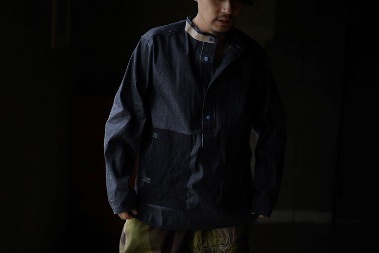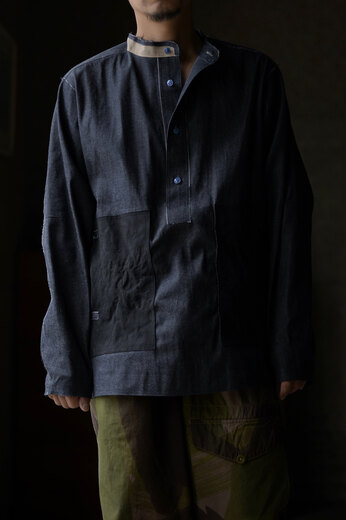 着用と洗濯を繰り返す内に良い色になっていきそうなデニムパンツと同じライトオンスのデニムを使ったプルオーバー。襟にはリネン、ポケットにはウルトラスエード、その中にアルミニウム。雰囲気のあるデニムと変わった異素材が組み合わせさり、独特な趣に感じます。ポケットはアルミニウムが入る事により好みのシワを付けられる。あるいは自然にシワが入っていく。インディゴがフェードしていって他の素材とのコントラストが生まれる。デニムシャツにちょっと+して、違った面白さを味わえる洋服だ。