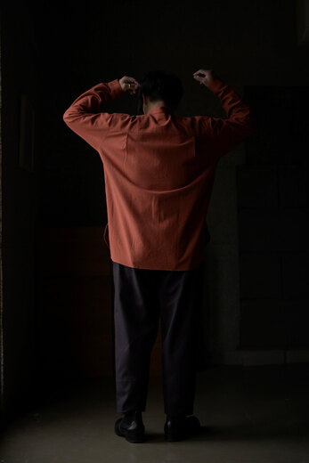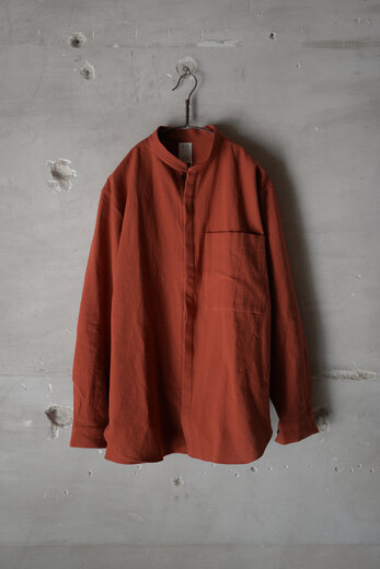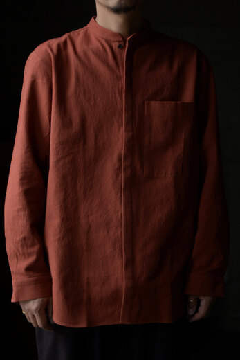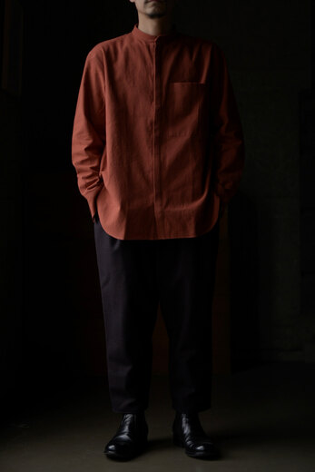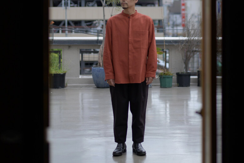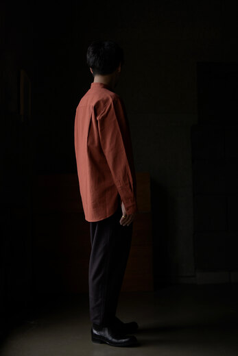 首元の収まりが気に入っている定番のクルタシャツ。今回は節織のコットンで日本の作業着として作られていた生地。現在でも1日に30mしか織る事が出来ないシャトル織機でゆっくり、空気を含みながら織られています。だから着用を繰り返す事で柔らかくなり、経年変化を楽しめるのです。少し発色を抑えたレンガ色。同系色で組み合わせたり、デニムも穿きたい。羽織ると少しだけ秋の気分になりました。