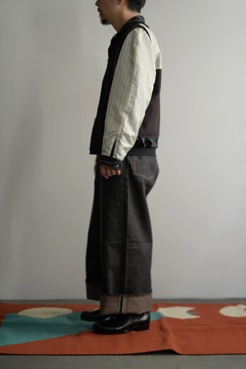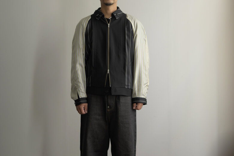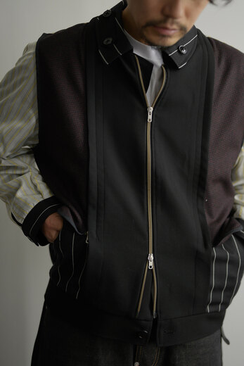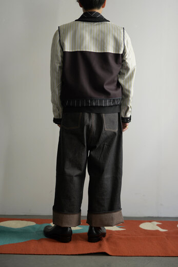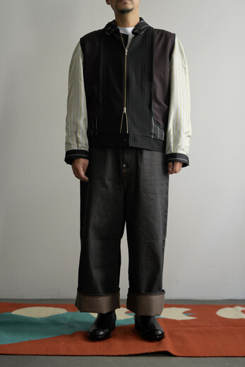 あのブランドのスウィングトップを裏返した、そんなデザインのスウィングトップ。僕たちはよく洋服を裏っ返して着ます。良い洋服って裏も綺麗で見せたくなるからです。それを体現してくれているような気がしました。ライニングを外すと単体でベストのようにも使え、本体は少しだけシンプルに。付けたり外したり、楽しい洋服。袖の表地がライニングなので、コートを羽織る際にも滑りが良く、チラッと見える裏地のような表地が視覚的に混乱しそうで面白いなと。クセは強いけど、着心地も良くて高揚できる。そんな洋服が改めて好きだなと感じました。