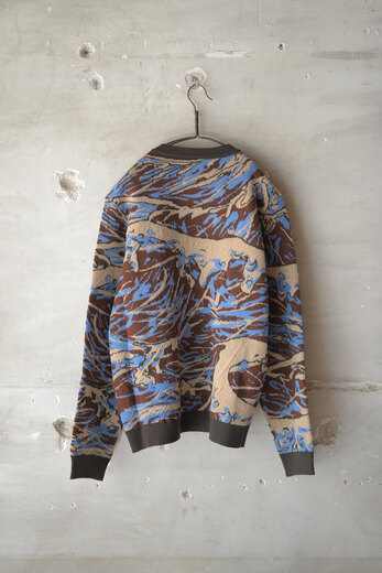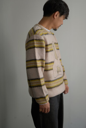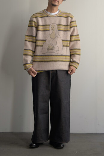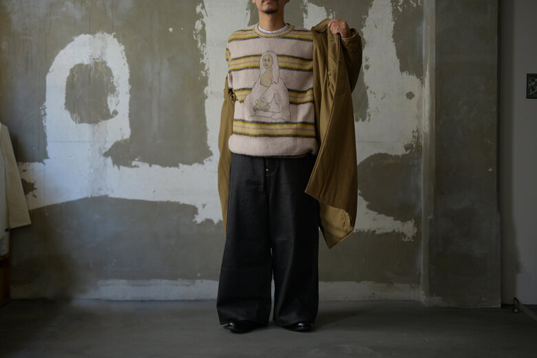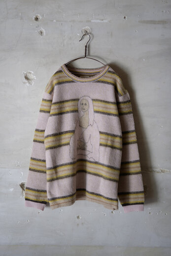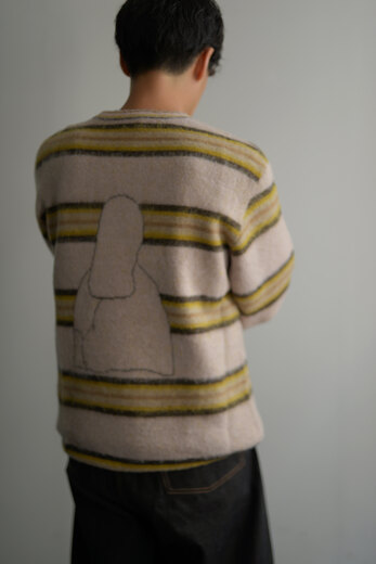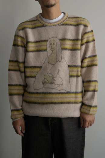 Kota Gushikenの卒業コレクションでランウェイを歩くMona san(モナリザ)は大胆で首が揺れる感じで可愛かった。次に見たMona sanは髪の糸や洋服の糸などが違う種類で表現されていて、繊細でかわいかった。Mona sanを発表した時に世界初のモナリザの後ろ姿です。って言ったら先生たちがWow!ってなったというエピソードを聞いてそのエピソードがすごく好きになった。そして、元々はバスキアのモナリザの柄からニットを作ったのだと今回知った。ダヴィンチのモナリザはあのモナリザ。バスキアのモナリザはバスキアで、Kota GushikenのモナリザはもうKota Gushikenだなってなった。個人的にKota Gushikenのボーダーの色合わせが大好きなのだけど、完璧にまでも絶妙でノイズになりそうでならない色合わせが上手いなーって思う。今回は絵画のバッググランドの森や川や地面をボーダーに置き換えていて、フワフワしたベースも相まってMona sanを薄目で見ているみたいにボヤっとしているのが可愛いと思って一番ボヤっとしている色目を選びました。どうだろう、KotaGushikenのモナリザを着てみたら案外いろんなこと楽しくなりそうな気がするんだけど、そういう服ってそうそうないしね。