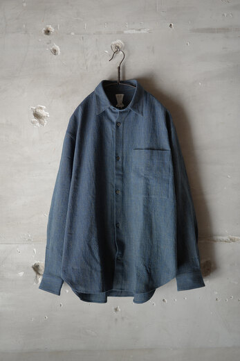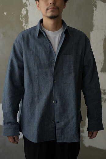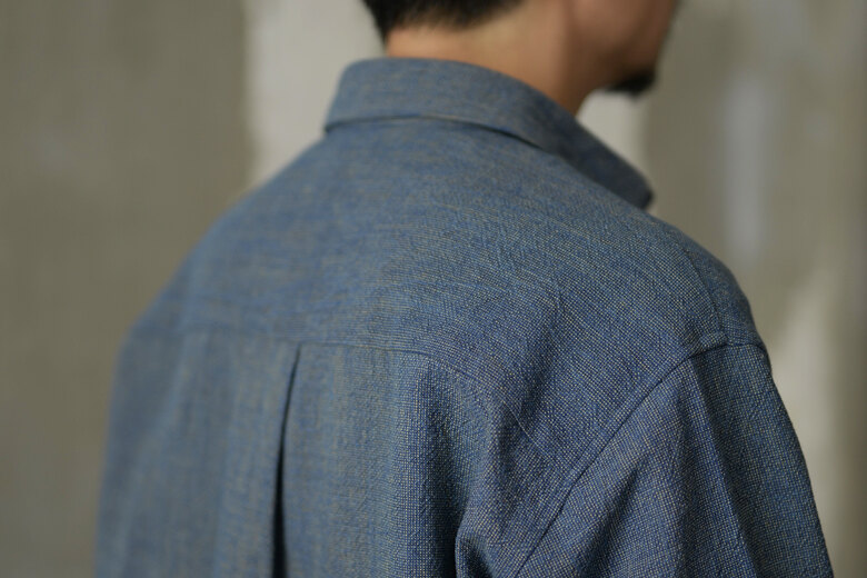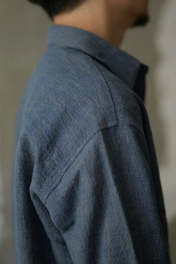 KURTA SHIRTと同様に日本の作業着として作られていた生地。現在でも1日に30mしか織る事が出来ないシャトル織機でゆっくり、空気を含みながら織られています。インディゴの糸と柘榴の木の皮で染めた草木染めした糸。異なる色の糸を折り合わせた素材。見る角度によって黄色が浮き出て見えたりインディゴが強く見えたり。ムラのように感じる色合いが面白い。労働着として作られてきた生地なので、すごく丈夫です。着る度に馴染んでいきます。そしてインディゴと草木染めの色の変化も楽しめる。上品なETERNAL SHIRTのデザインにワークウェアの要素と天然の染色が絶妙に混じり合うシャツ。