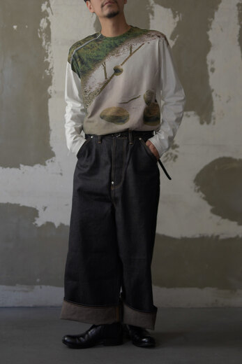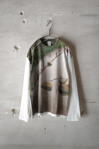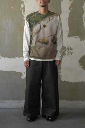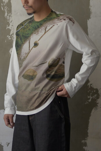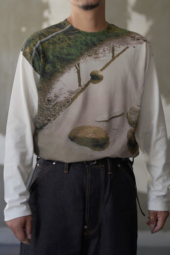 その土地の空気を切り取り、Tシャツに収める。その空気を心地よく感じられるものに出会える事は多くありません。主観ですがセヤのTシャツはその心地良さを毎回感じられ、集めたくなっている自分がいます。セヤのルックブックを撮影しているJeff Boudreauさんがイギリス北東海岸で撮った写真を肩先と首元まで大胆にプリントしています。脇線を後ろに少しずらして立体的に、袖は2枚のパーツで構成した凝ったディテールのTシャツ。
