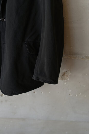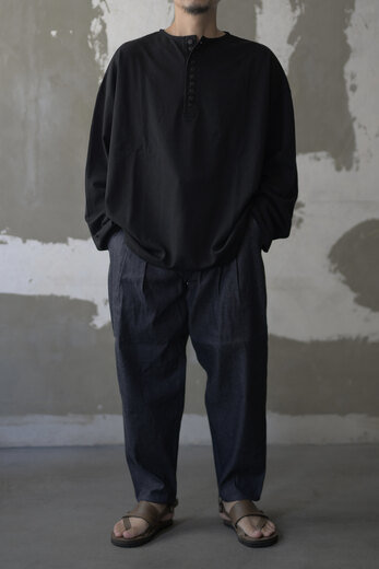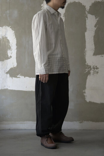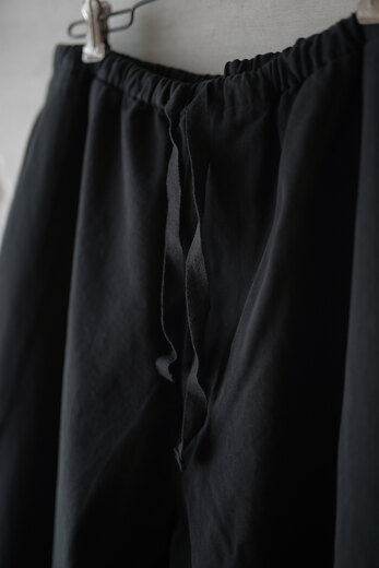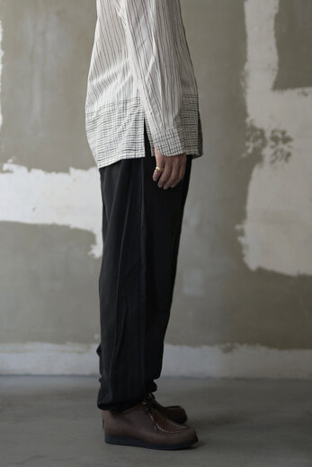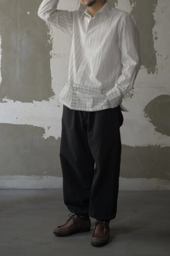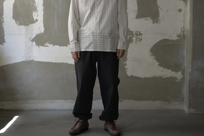 こればかり穿いていると『戻ってこられなくなる。』らしい。楽なパンツである事は間違いないが、穿き心地に加え野暮ったく見えない。日常着としてはピッタリなパンツだ。だからこそ支持され続けているのかもしれない。製品染めのコットンツイル。まるで昔の使い古されたワークウェアのような雰囲気のある素材。ウエストはゴムと紐、裾にもゴムがあり靴が隠れない。コモリの中では定番の形であるドローストリングパンツはある意味1つの完成形とも言えるパンツだと思っている。