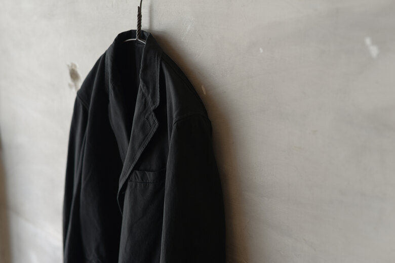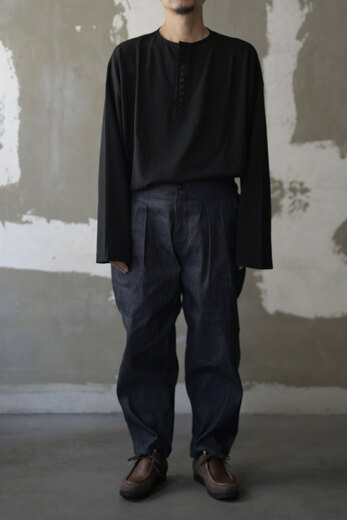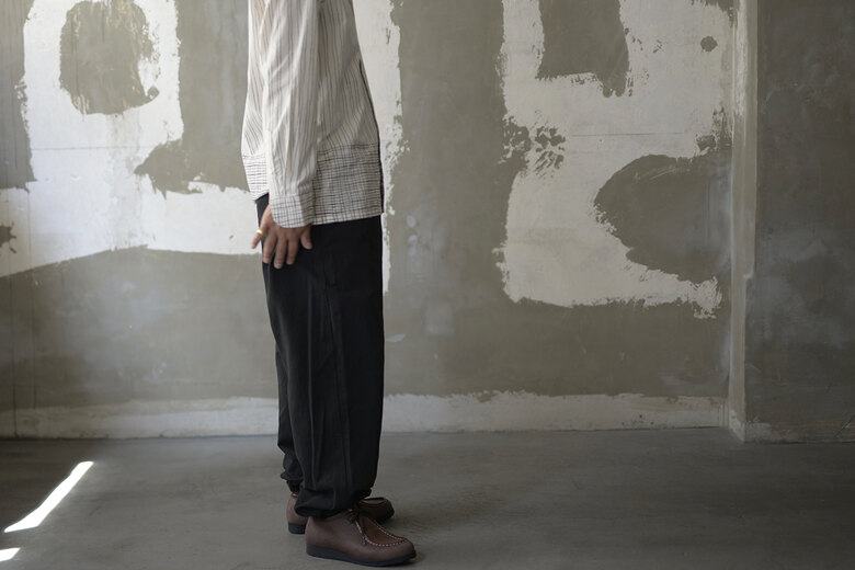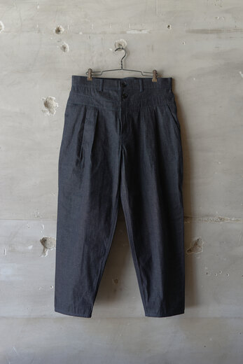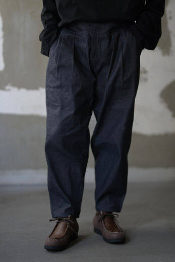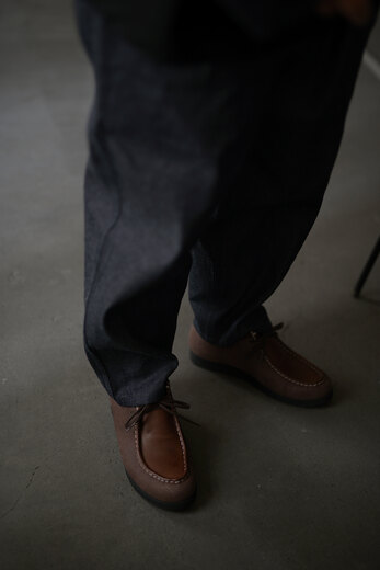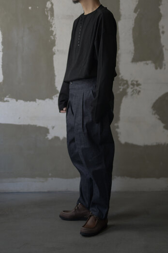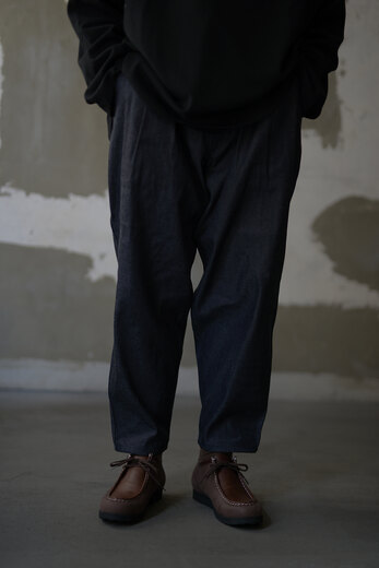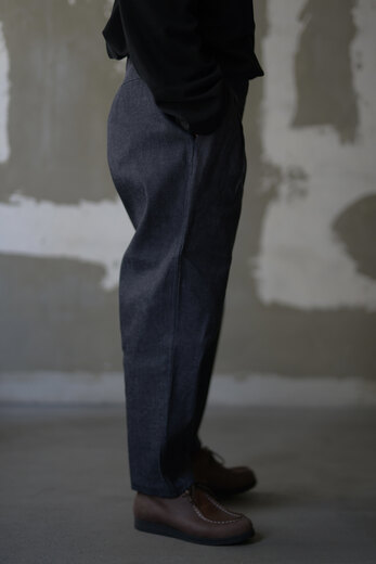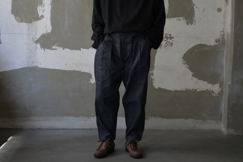なんだか懐かしい感じがした。久しく穿いてこなかった形でもあったから新鮮にも感じた。でも僕の中ではいつでも肯定されている形だったからすんなりと受け入れる事ができた。少しテーパードの効いた丈の短めなパンツ。日本のモンペから着想を得たらしく、そのままという訳ではなくタキシードパンツのような古いトラウザーズの雰囲気、ワークウェアの要素もある。今からでも穿けるライトオンスの味のあるデニム。『これは良い色落ちしそうですね!』とデニム好きの方も太鼓判でした。