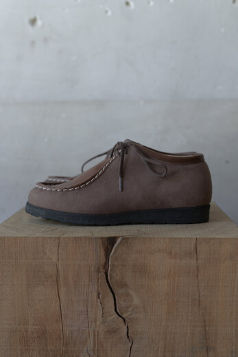 アルプス山脈のチロル地方にて放牧の際履いていた靴が原型と言われているチロリアンシューズ。平坦ではない道や傾斜のある所での作業に適していた事を考えるとワークウェアの1つなのかもしれない。オイルをたっぷり含んだホースレザーを表裏で使っており、グリップ力のある吸盤状のビブラムソールで地面が濡れていても安心。着脱可能なカップインソールはフカフカでまるでスニーカーの様な履き心地。実際に履き込んでみて、革の経年変化の素晴らしさや歩行のし易さからオーダーしました。服の色によっては黒い革靴だとコントラストが強くなり過ぎる事が多く、茶色は個人的にオススメな色。『茶色の革靴持っていなくて』、『茶色って結局1番履くんですよね。』・・・そんな方々が選ばれています。