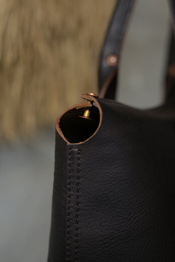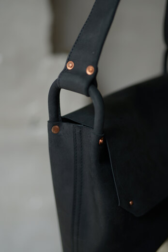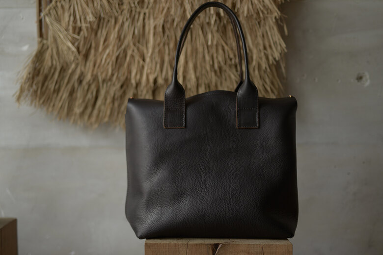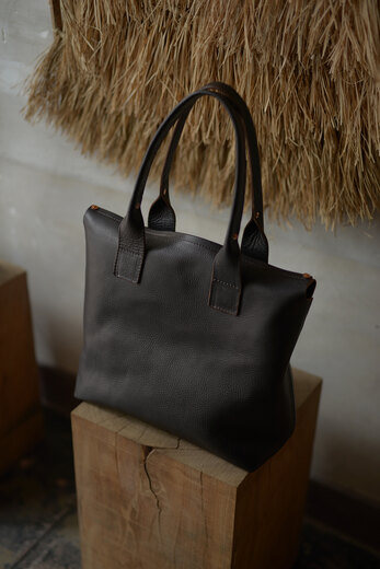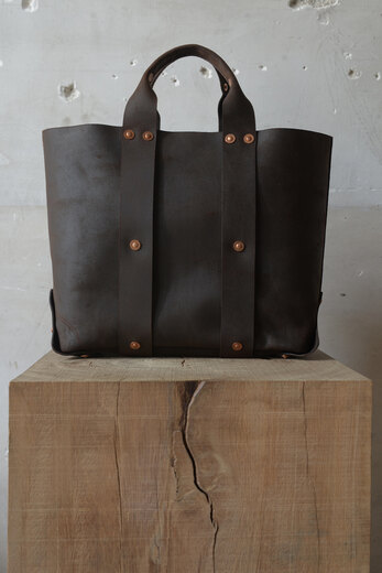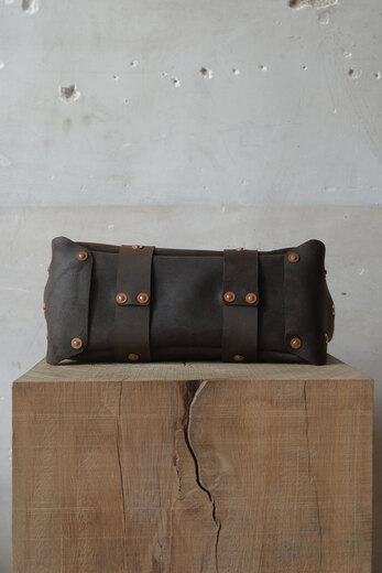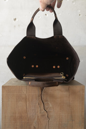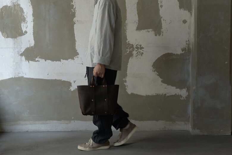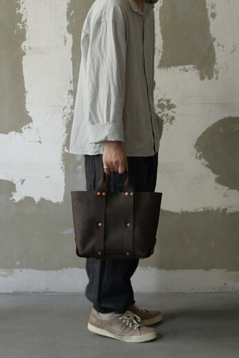 鞄を持つこと、それは荷物を入れる為でもあり洋服と同じ様に気分を上げてくれる。洋服との色合わせでコーディネートをしたり日々変化する革の雰囲気を楽しんだり。ただの道具としての鞄ではなくて、常に楽しめる鞄を使う事が重要でTochcaの作る鞄はどれも使っていて楽しい。これでもか!とリヴェットを沢山打ち込んだとても頑丈なトートバッグ。打ち損じは出来ないのでかなり神経を使うそう。持ち手は短いですが、荷物を入れて持った時に重心がブレない絶妙な長さ。肩掛けする事を完全に排除し手持ちのみに特化する事によってこのトートの快適さが生まれている。レザーは高級靴にも使われるオイルがたっぷり染み込んだWAX SUEDE。使っていく内によく擦れる部分は毛が寝て、良い艶が出てきそうな革。かなりしっかりした素材なので、屈強なリヴェットトートとの相性も良いと感じました。小ぶりで可愛らしいminiサイズ。普段使いにちょうど良い大きさです。