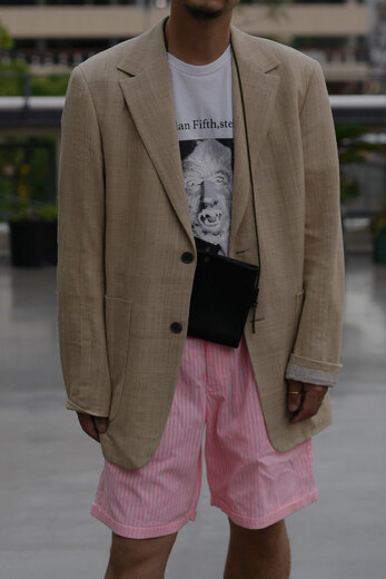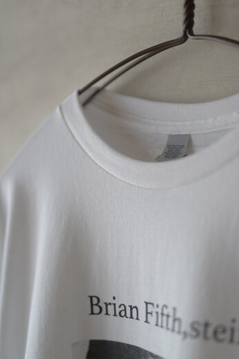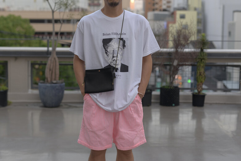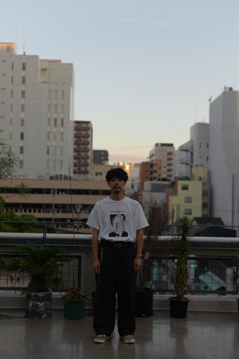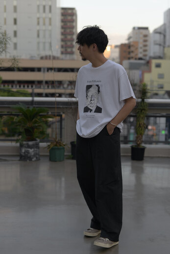 暑い!Tシャツ!太陽!夏! !!!!!! やっぱりびっくりマークが似合う気がする。でも自分たち的にはこのTシャツはそんな ! が付かないイメージがした。夜遊びに行く時、ちょっとドキドキしてワクワクもする。背伸びしてお洒落をしたいと気持ちになった。昼間の元気いっぱいの太陽の下のTシャツというよりは夕暮れ日が落ちてきてからのTシャツがあっても良いと思う。今日も大阪は35度らしい、昼間より夜遊ぶ方が健全かもしれない。もう私たちは朝まで起きてることがキツイけど、あの朝ちょっとづつ明るくなる頃に真っ黒になった目元とかも気にせず、ウゲーって感じで家路につくあの感じにも似合うんじゃないかなこのTシャツ。と思った。ジャケットの中とか革靴とか時計とかと合わせたりしたいなと…