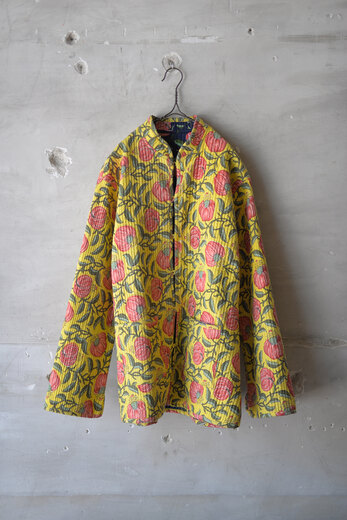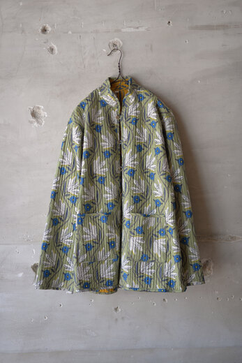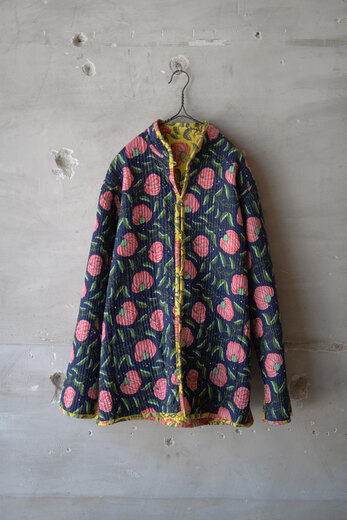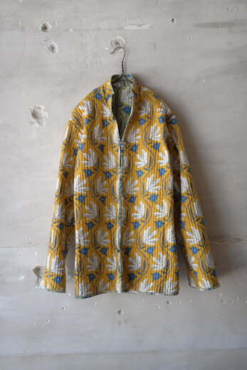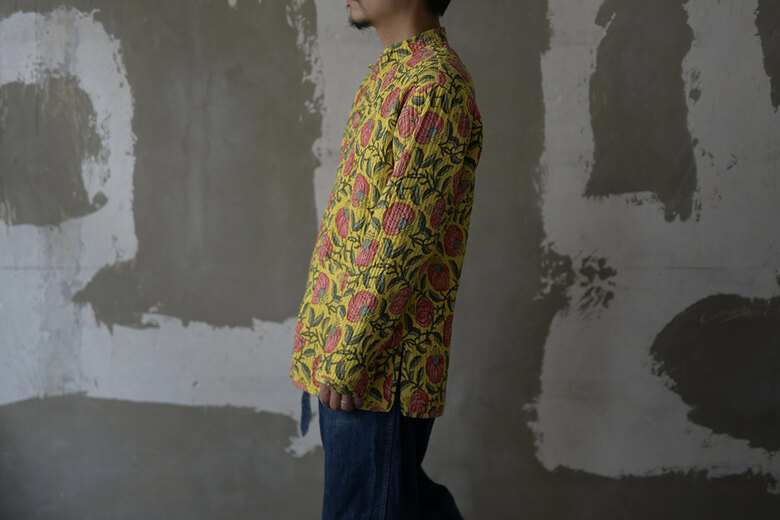 インドの手仕事を伝えるPERIOD FEATUERS。 手織り物の産地であるウエストベンガルの小さな村で、糸を紡ぐ所から洋服になるまで全て手作業で行われています。 カディやシルク、麻。お店でも夏になると涼しい洋服が届く。それは夏の風物詩かのように。ピリオドフューチャーズはどこか温かみのある洋服。人の手が加わっている、そんないつもは見えない背景を感じ、想像し、着る事を楽しめる。ふと次回の夏の新作の話を聞こうと思い連絡すると、『こんなのがあります。』と写真を送ってくれた。それはシルクスクリーンプリントを施したキルティングジャケットだった。実際に見たかったので、次の出張の時に見にいく事にした。沢山の色、沢山のモチーフからなる柄は見た瞬間から心が奪われた。元々柄物が好き、という事も恐らくあると思う。しかし最近は無地の物を見る事が多かった為、より新鮮に感じられたのかもしれない。さらにリバーシブルなのでその日の気分で色を替える事が出来る。何となく頭の片隅にあった冬に使うオーバースペックではないアウターのインナー。それにちょうど良いのではないか?と思った。