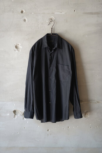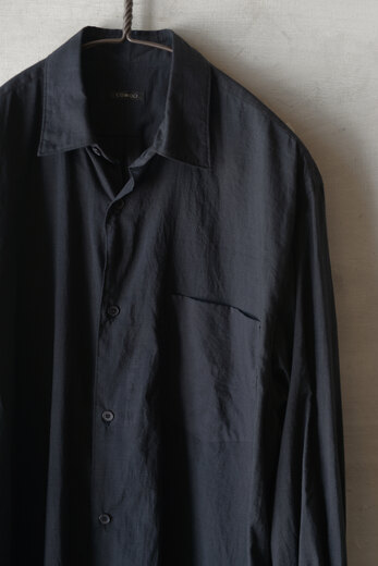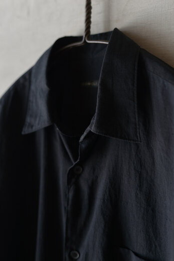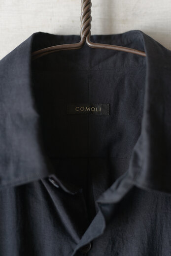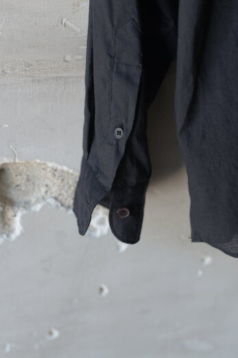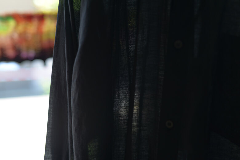 『もしかすると、リネンよりも涼しいかも。』と購入されたお客様が言われていた。夏を快適に過ごせるカディコットン。インドで手織りで作られている織物。汗をしっかり吸って乾きやすく、透ける程薄くて風が通りやすい。軽くて柔らかく、繊細に感じるけどとても丈夫な生地です。薄いから涼しいという事もあるけれど、素肌に直射日光が当たる部分を減らせる事も重要で、日傘に例えるとわかりやすいかもしれない。肌に日影を作ってあげる、そんなイメージです。そしてコモリシャツ特有のフワッとしたシルエットと夏に着る漆黒。それがまた何とも格好良い。