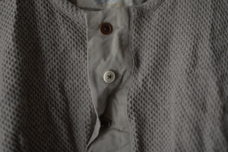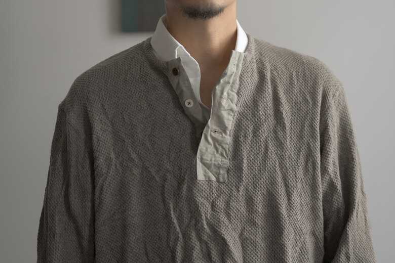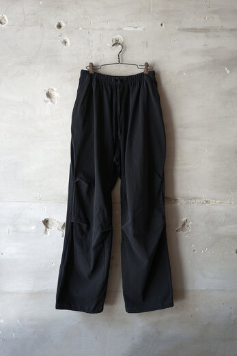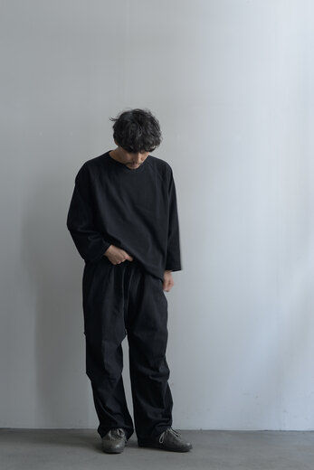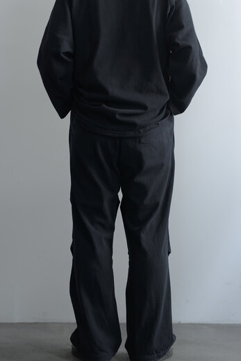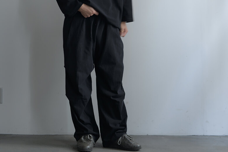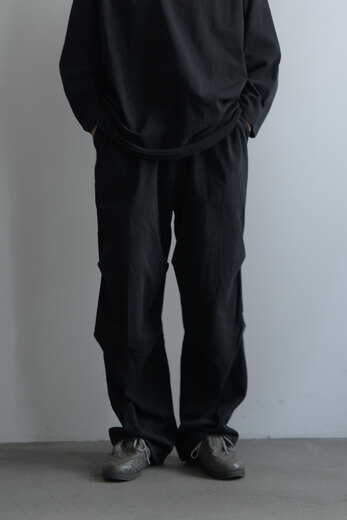 膝にタックを加え、ミリタリーパンツの要素をデザインに落とし込んでいます。ドライな空紡糸で折り上げたジャージー。スウェットパンツのようなニュアンスですが、そのタックが入ることでラフになり過ぎない気がして良いなと思いました。自宅でも外出先でも、穿き心地が良い軍パンです。少し洗いを掛けて褐色させてあります。初めから少し小慣れた雰囲気で着用でき、穿き込んだ先が少し浮かぶようです。