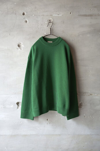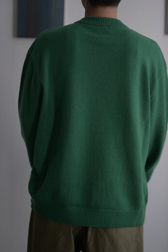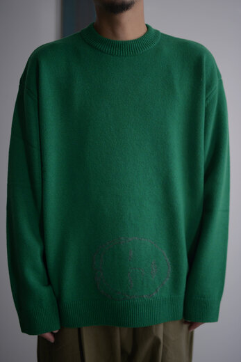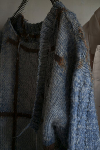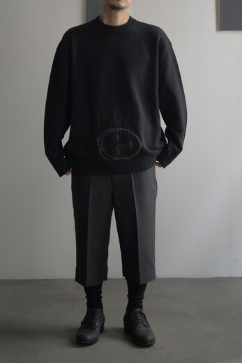 刺繍とも違うしプリントでもないし、ニットにこのように絵のような(絵と言ってよいのかな?)ものを描くって、よくよく考えてみるとすごく不思議で、ユニークで、面白い。Kota Gushikenのニットを知ってからもうすっかり数年経ってたくさん見てきたのに、なぜか今回の顔を見て改めてその凄さに唸った。一見すると無地のシンプルなニットの裾に、ごろんと横たわる彫刻家のブランクーシからインスピレーションを得て生まれた柄。なんとも不思議な光景で、同じように首を傾けたくなるし、忘れがたいほど印象的で、かっこいい。顔に使われている糸とボディーカラーのバランスがすごく好きで、この2色を選んだ。それと、いつも通りとても心地の良いニットです。顔はぼやりと優しいのに着ると全体をキリッと締めてくれる1着です。