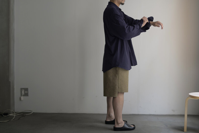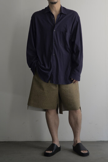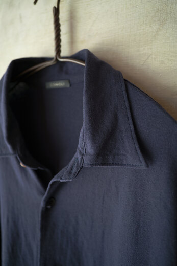 これからは暑くなっていく一方で、半袖がメインになってくる。でも長袖が着たい時もある。着ないといけない場面もある。室内や電車の中は寒い場合もある。汗っかきの僕はブロードの様なシャツ生地だと汗染みがとても気になって仕方がない。このシャツは空紡糸の天竺で作られたシャツ。天竺という事はTシャツだ。汗をかいても目立たないし、洗濯機でしっかりと洗えるのが嬉しい。デザインのベースはコモリシャツ、ヨークを排除し、生地自体が薄く柔らかいのでよりリラックスした雰囲気に。汗っかきでもラフに羽織れる長袖のシャツ。