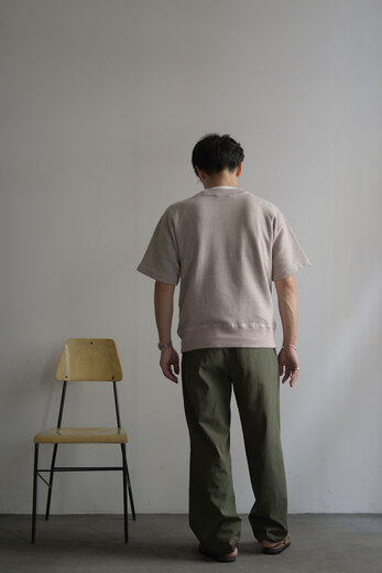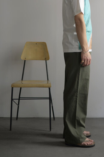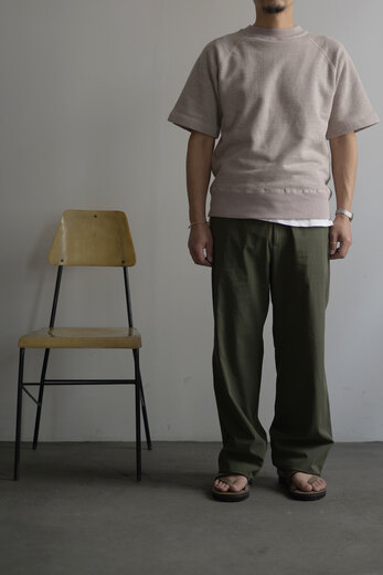 『最近パンツはセヤばかり買ってる気がします。』とお客様が言われていました。僕自身もセヤのパンツは良く穿いています。上品な雰囲気なのにラフで、そのラフさが大人だなといつも感じています。ノータックで太ももはややゆとりがあり、裾は少しフレア。ウエストベルトがなく、ポケットのステッチがウエストの上部まで続きている。麻が入っていそうなシャリっとした涼しげな生地は糸にガス焼きを施したコットン。強撚糸のような印象です。ドレープが美しく、自然と高揚していく気分を味わえるSIWA PANTS。