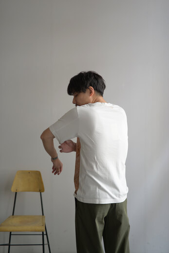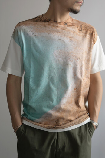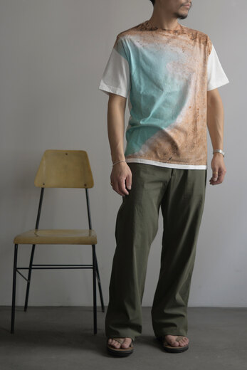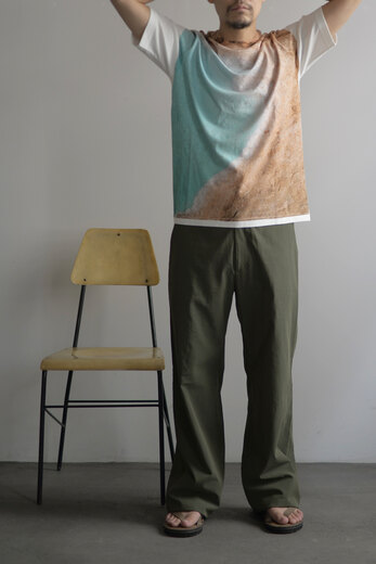脇線を後ろに少しずらして立体的に、袖は2枚のパーツで構成し、凝ったディテールのTシャツ。セヤのルックブックを撮影しているJeff BoudreauさんのSiwa Oasis撮り下ろしをプリントしています。フォトTeeはコレ!というものに出会う事が少ない。プリントの大きさや写真や色、全てが気に入ったものでないと難しい。seya.のTシャツは肩先、襟元までの大胆なプリントとオアシスと砂漠の色、写真から空気が伝わってくるようで・・・。一枚でもインナーでも色々な組み合わせを楽しめそうだ。