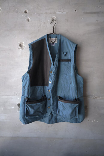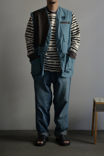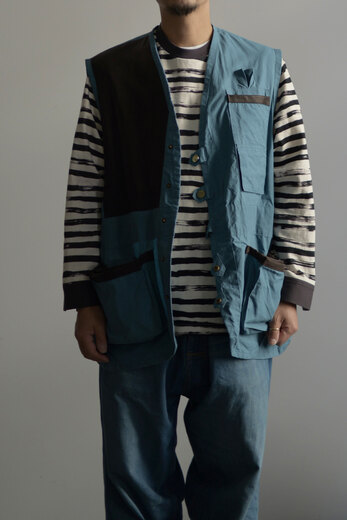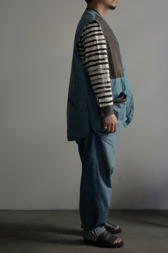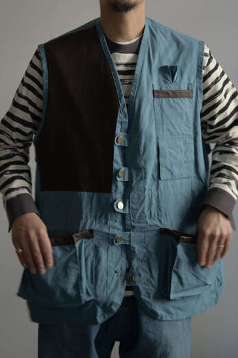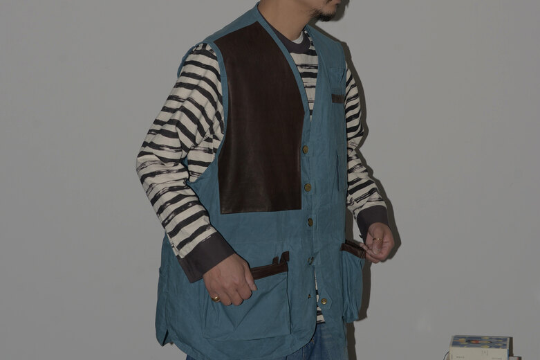 古いフィッシングベストをオマージュしたHAVORJACK。本来はメッシュ仕様のベスト、とても形が良かったので、年中着たいと思って共生地仕様に変更してもらいました。生地は英国はHalley Stevensonオリジナル素材のHYBRID AERO。従来の耐水性を備え、ワックスをほとんど使わないワックスコットン。全くベタっとしておらず、天然のコットンの風合いとワックスコットンの経年変化も楽しめる素材。軽いので肩が凝りません。昔好きでよく着ていたアウトドアブランドの色を思い出しこの色を選びました。ブラウンのレザーとの相性も良く、春夏はTシャツやノースリーブ、秋冬はコートやジャケットの上に・・・そんなイメージだったのでサイズはあえてXLのみに。ちょっと物足りない時にプラスするようなアクセサリーのようなベスト。