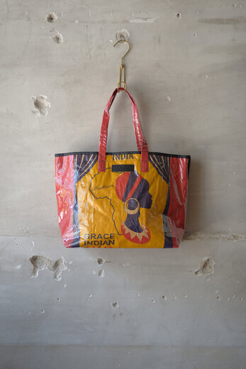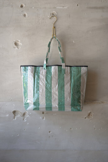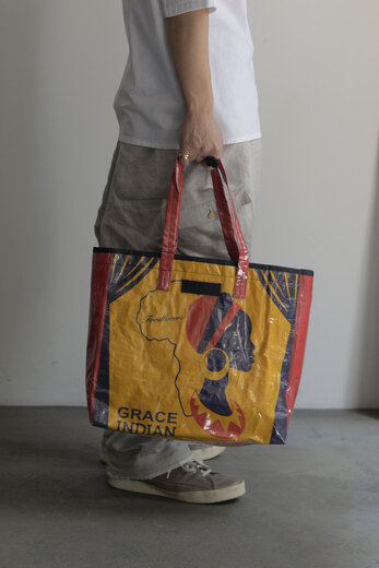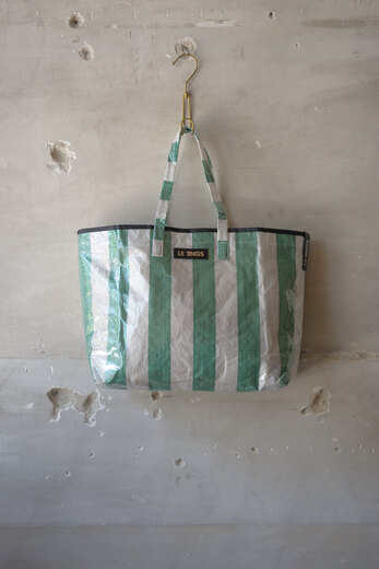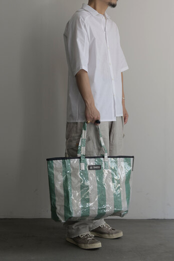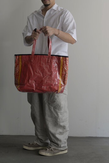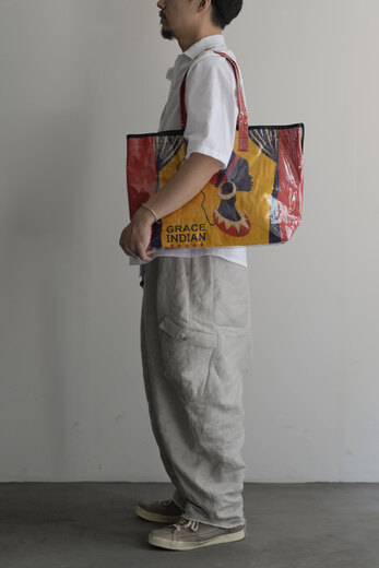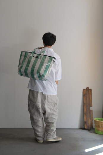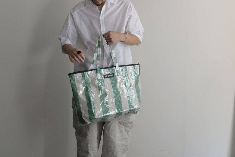 鞄は通勤通学や旅で、荷物を詰め込んで運ぶもの。そんな道具としての役割も大切だけど、まるで装飾品の様な意味合いも持っている様な気がしている。日々使うものだからこそ自分の個性がより際立ち、その日の洋服との組み合わせを考えてコーディネートができる。それが面白いと思えたら、いつもと違う1日を過ごせるのかもしれない。LE TINGSは真剣に本気で、楽しみながら物作りをしている。使用している素材は使い終わった米袋。米を入れていたのだから耐久性は申し分無い筈だ。コーティングされているPVCも同じくリサイクル。そして縁にはパイピングを施している。中はコットンのライナーがありポケットが一つ。何も考えず荷物を放り込める。全て色や柄域も異なり、一点モノなので選ぶのが楽しい。使い易く、面白いけど上品な鞄だ。