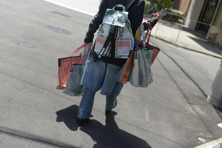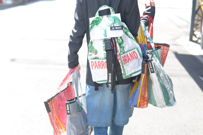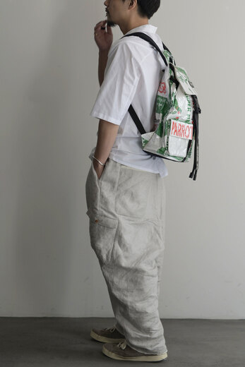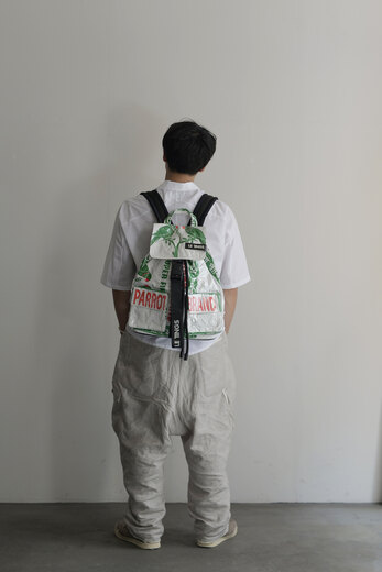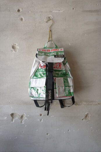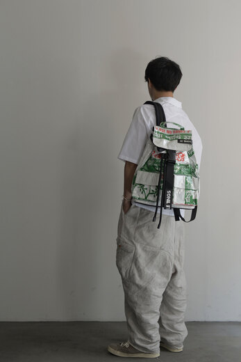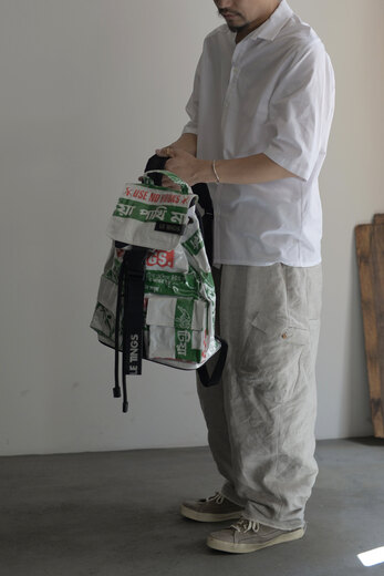 鞄は通勤通学や旅で、荷物を詰め込んで運ぶもの。そんな道具としての役割も大切だけど、一つの装飾品の様な意味合いも持っている様な気がしている。日々使うものだからこそ、自分の個性がより際立ち、その日の洋服との組み合わせを考えてコーディネートができる。それが面白いと思えたらまた違った1日を過ごせるのかもしれない。LE TINGSは真剣に本気で、楽しみながら物作りをしている。使用している素材は使い終わった米袋。米を入れていたのだから耐久性は申し分無い筈だ。コーティングされているPVCも同じくリサイクル。そしてパイピングを施したり、フロントにはポケット2つ、ririzipを使った背面のポケットがある。中はコットンのライナーがありポケットが一つ。何も考えず荷物を放り込める。全て色や柄域も異なり、一点モノなので選ぶのが楽しい。使い易く、面白いけど上品な鞄だ。