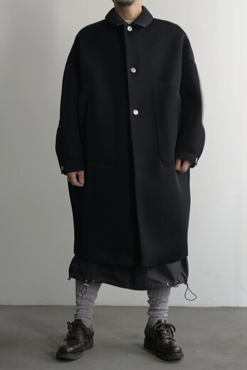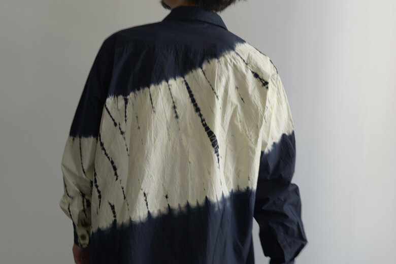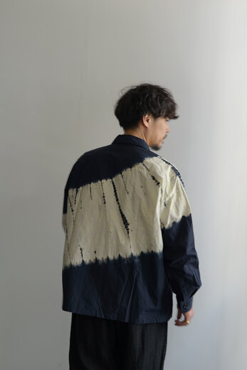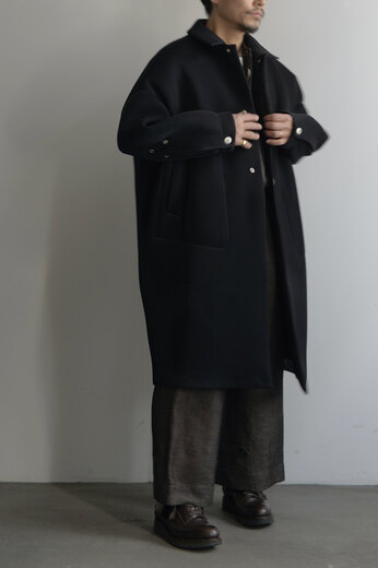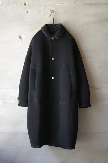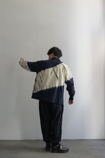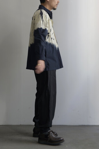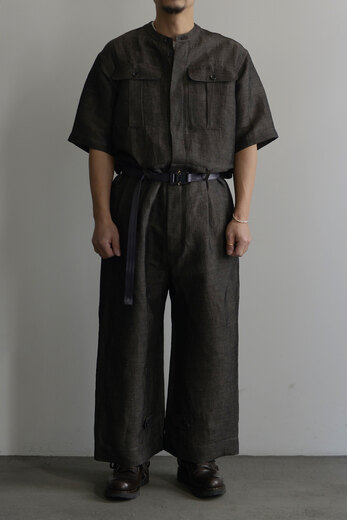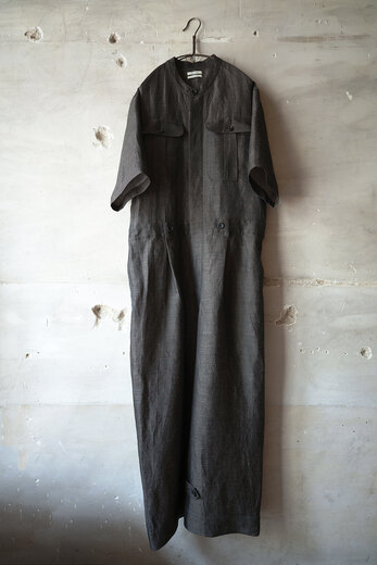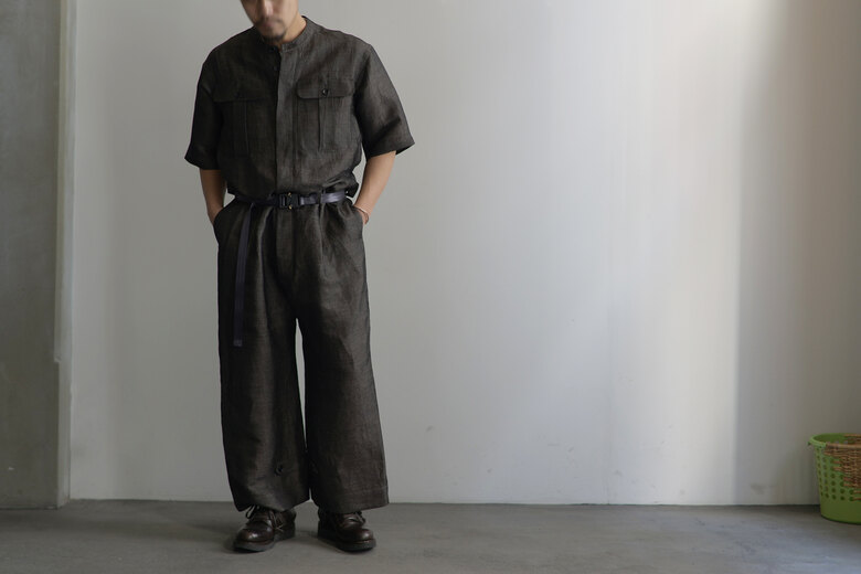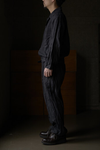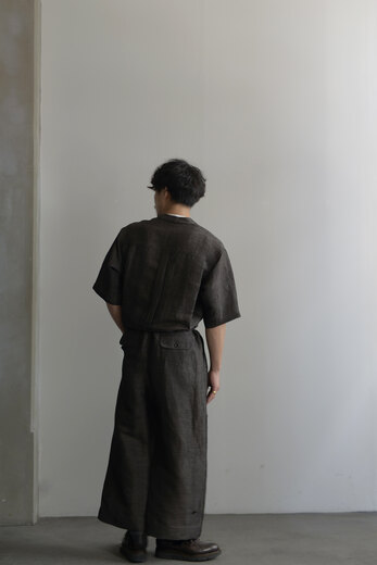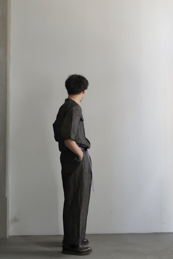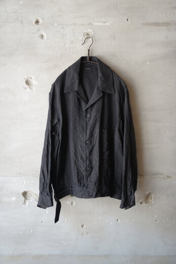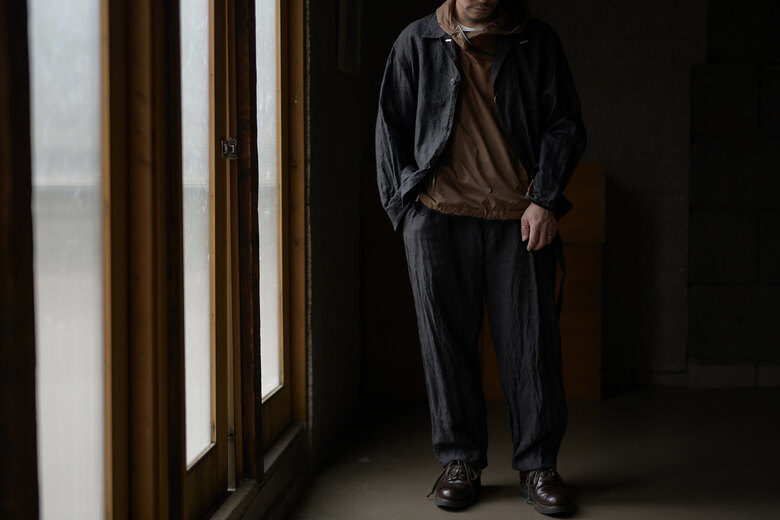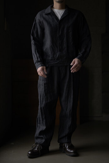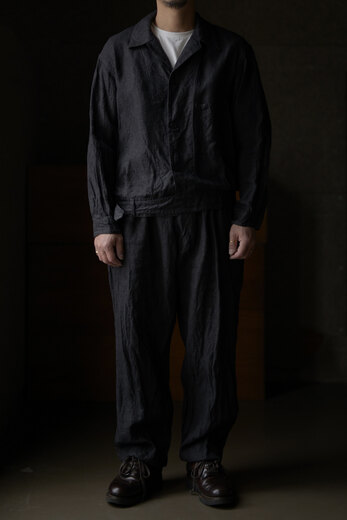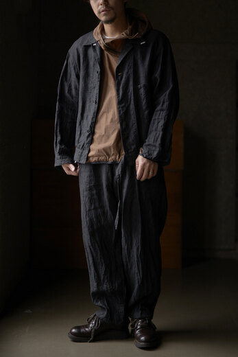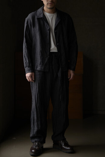強めに洗いが掛かったデニムのような良い雰囲気の生地が目に入り引き寄せられた洋服。触ると真夏でも涼しく着れそうな程に軽く、リネンだと気付く。深みのあるチャコールは着古して褐色していく様が何とも良さそうだと感じた。前を開けて羽織りとして、ベルトを絞めて同素材のドローストリングパンツと組み合わせるとオールインワンの様にも見える。色々な着方が楽しめるジャケット。