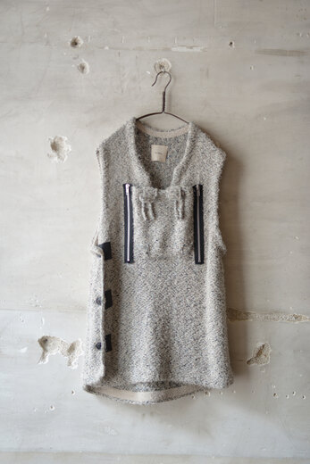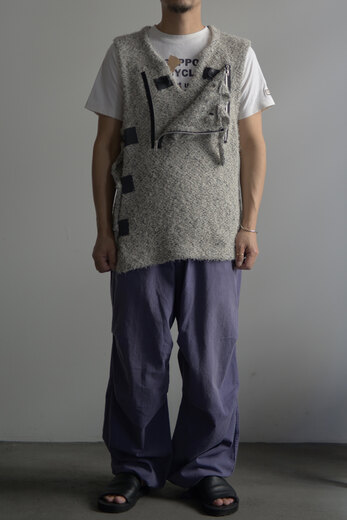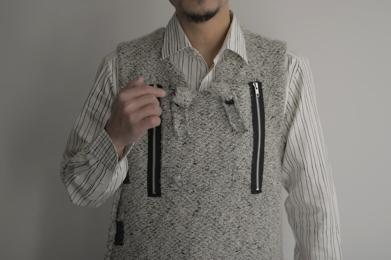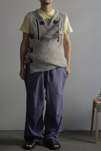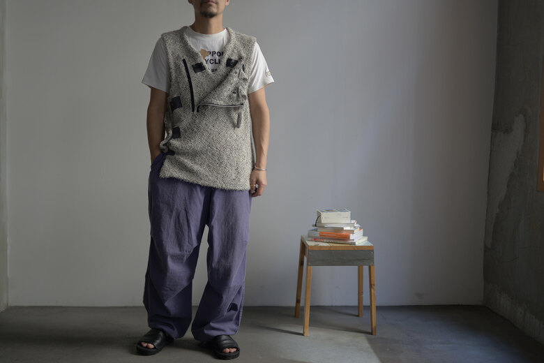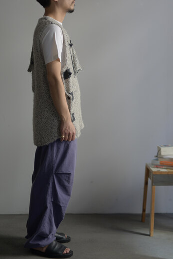 ツイードっぽい編み地をミリタリーで作ったら可愛いかな、と思って出来上がったのがこのベスト。ツイードの様に沢山の色が混ざり合う編み地を家庭機で編みながら考えたそう。その色目は茶色っぽい色目だったり、グレーっぽい色目だったり複雑な色目が混ざり合い、ピロピロっとした糸がふわりとした印象を与えている。片側に付いているボタンの付け根に施された生地がリフレクターだったり、大胆に付けられたzipだったり、フライトベストをモチーフとして作られているからなんだけど、その相反する感じがとてもユニークだ。まだ寒いからシャツの上に合わせたのだけど、Tシャツやカットソーの上にはもちろん、ノースリーブの上にもカッコ良いんじゃないかなと思っている。君らしい合わせ方でふわりとしたミリタリーを楽しんで欲しいです。