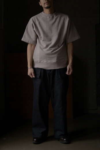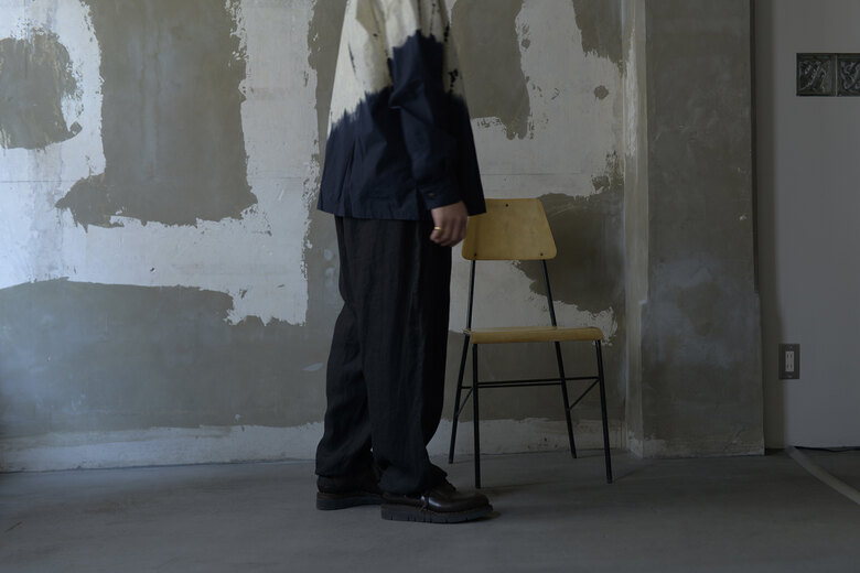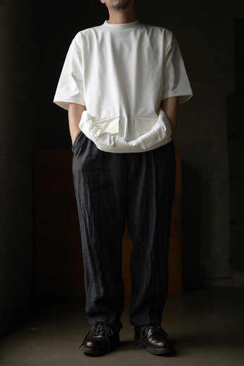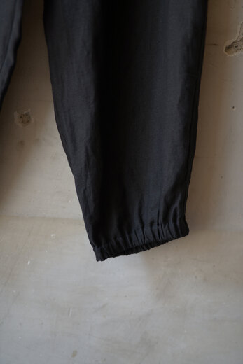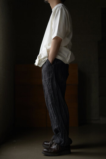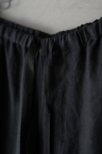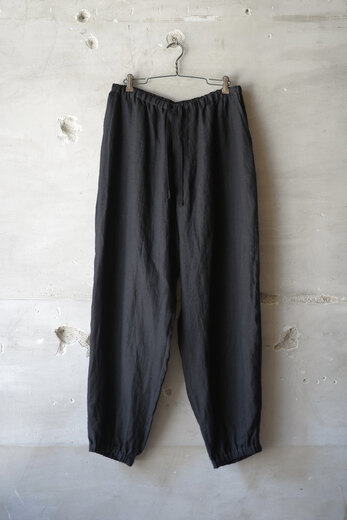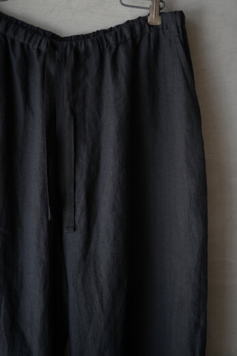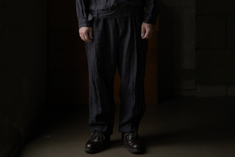 強めに洗いが掛かったデニムのような良い雰囲気の生地が目に入り引き寄せられた洋服。触ると真夏でも涼しく着れそうな程に軽く、リネンだと気付く。深みのあるチャコールは着古して褐色していく様が何とも良さそうだと感じた。ウエストはゴムとドローコード、裾にもゴムが入っていて中に入れ込んでスッキリさせたり、裾を溜まらせて穿いたり。とても快適なパンツ。同素材のベルテッドジャケットと組み合わせるとオールインワンの様にも見える。色々な着方が楽しめるドローストリングパンツ。