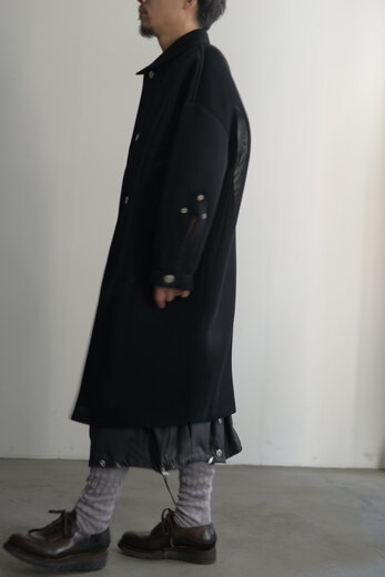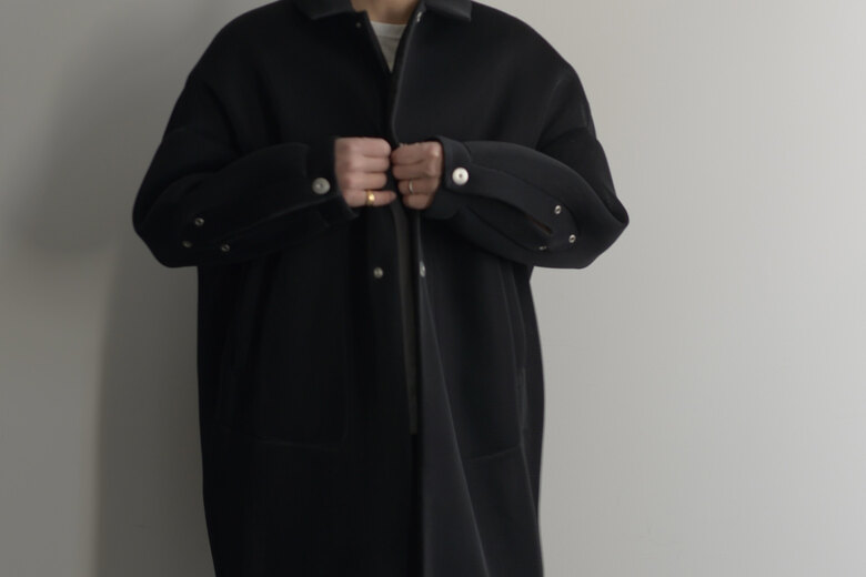 弾力がありしっかりしたメッシュ生地を使ったコート。裏地が付いているのだが、動くとその隙間に光が通ってぼやっと透ける。それがまた立体感を出す。そして、めちゃくちゃ軽い。一見、生地としては異質なものに感じるのだけど、合わせることにより、異質同士が近くなる。Omar Afridiの洋服はクラシックだなと感じると、すぐに新しいと感じたり、未来も想像させたりする。未来=見たことのない世界と言ったら大袈裟かもしれないけど、思考が”違和感”(ユニーク)と”心地良い”(気分が上がる)を行ったり来たりするから惹かれたのかもしれない。そして、そのバランスが素晴らしくカッコ良い。で、軽めのコートって今みたいな中途半端な時期にすごく重宝する。