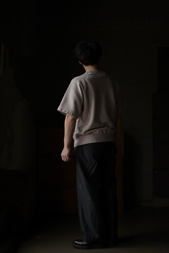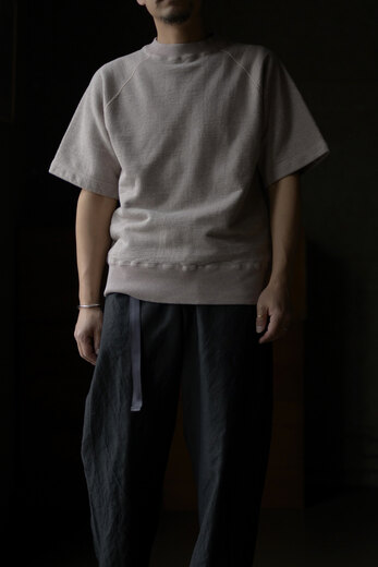 新たにSlopwslowが開発した裏毛のようで裏毛ではないインレイ編みの素材。リサイクルコットンでそこから製品染めをして長年着用して生まれる褐色を再現したカラーも魅力的で、初めからあの着心地を体感出来るのは何だか嬉しくなり選ぶ事にしました。slopeslowはちょうど良い塩梅に仕上げてくれる。昔友人が、『4月は嫌い』と言った。訳は『何か新しいことを始めないといけない気がしてが嫌だ』と言った。新たに!とかウキウキ!とか(びっくりマーク付けたくなるやつ)ではなくて、気を張らない4月があっても良い。そう思った。確かに春は寒暖差のせいか花粉のせいかかったるい。気張らなくてよくて心地よいこのシンプルなスウェットは気持ちも柔らかくしてくれる気がします。それに来年の春はもうひとつ柔らかくなっていると思う。