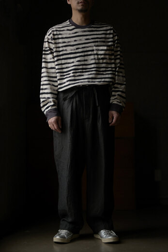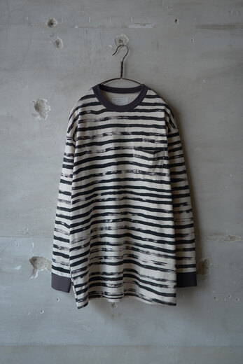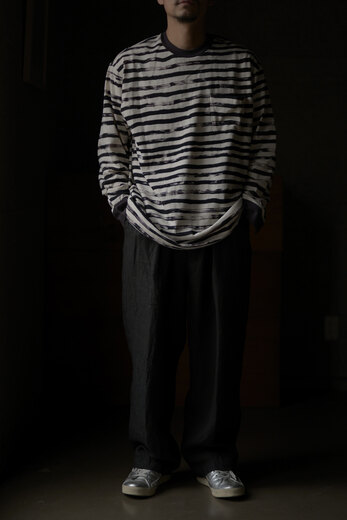 ボーダーのカットソーはある意味完成し切った洋服の一つであり、差別化する事が難しいアイテムではないでしょうか。BLACKBIRDで見つけたボーダーはカットソーの領域から少しはみ出ていて面白いと思った。ハンドペイントしたような雰囲気のボーダーを高度なスキャニングでデータ化しインクジェットプリントでヴィンテージライクな生地に落とし込んだそうだ。少しゆとりのあるフォルムに袖口がカフスのデザイン。ジャケットやシャツ、ベストなど色々な組み合わせをちょっと違った雰囲気で楽しめるカットソーです。