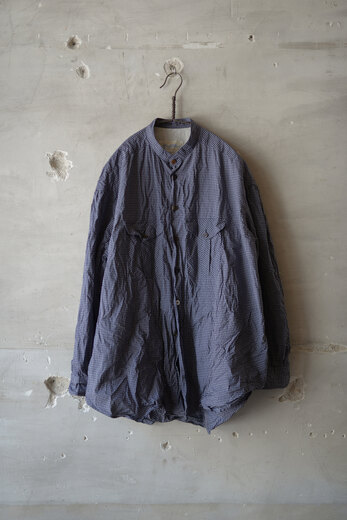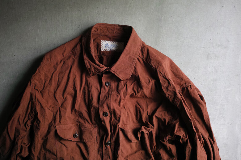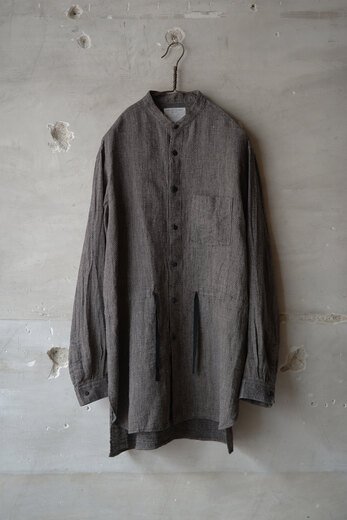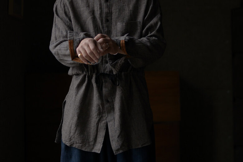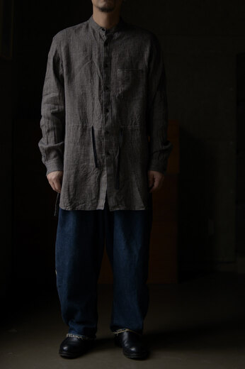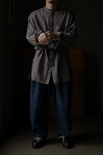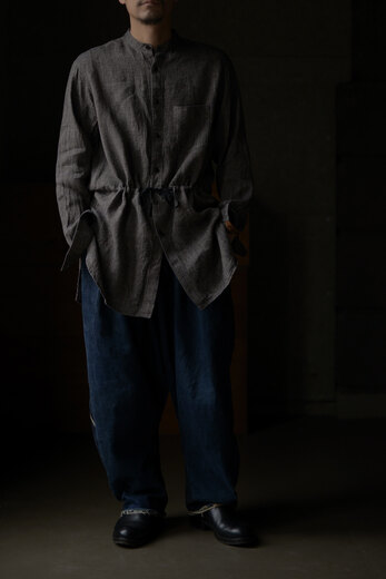 BLACKBIRDは様々な洋服とのレイヤードを考慮してデザインされている。ジャケット、コート、ブルゾンやニットなど組み合わせ、自由な発想で自由に着る事によって個性のようなものが少しずつ生まれてくる。自分だけの着方や使い方。そうやって嗜んでいくと自分に服が馴染んでくる。馴染むとより自分らしさが出る。洋服って面白い、そんな風に思えるようになります。1940年代のロイヤルネイビーのオフィサーシャツとインドの民族衣装クルタを併せたデザイン。剣ボロの裏にはフランス製のテープが施してあり、袖捲りした時にチラリと見えるのがかわいい。味わいのあるリネンシルクは洗っていくと良い雰囲気に。ウエストのドローコードでシルエットに変化が付けられる。一枚のシャツだけど、何通りも楽しめる洋服だ。