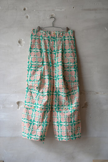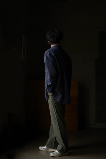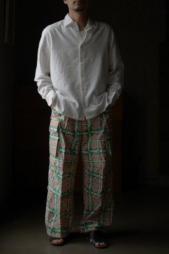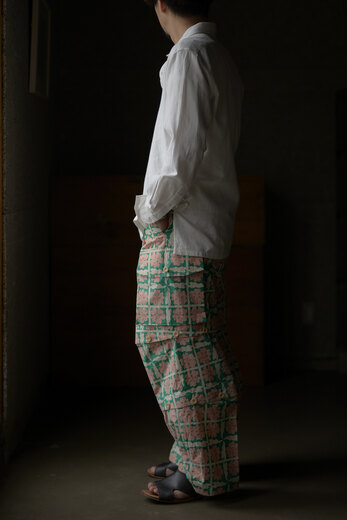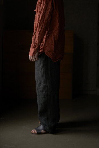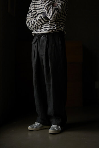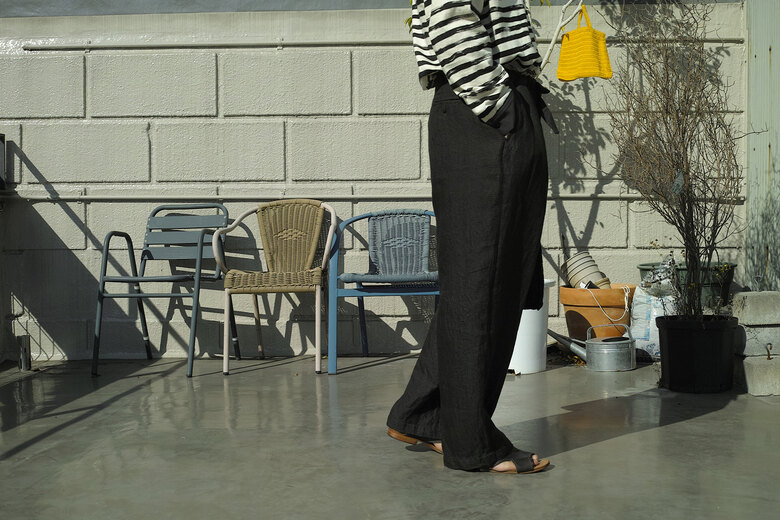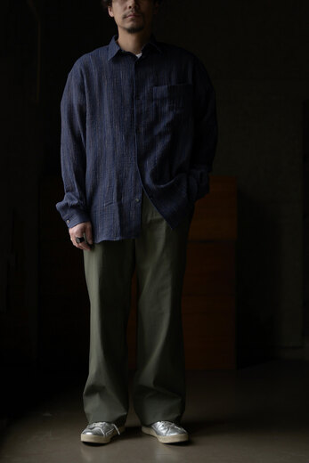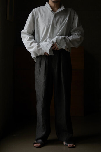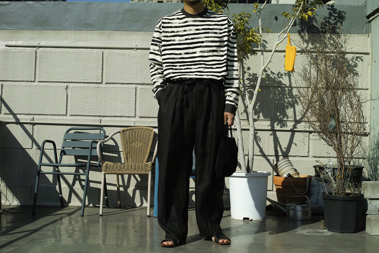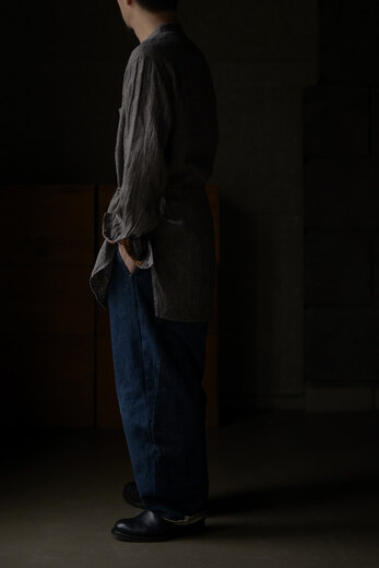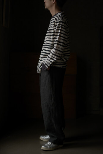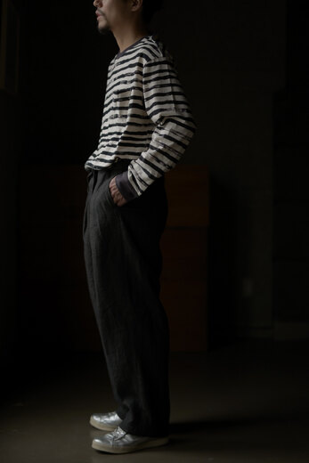 このパンツを見て穿いた時、あぁこれめちゃくちゃ穿くだろうなと思った。まずは緩く、リラックス出来る。次に心地良い。生地が心地良いのと程良い太さで風が抜ける。そして合わせやすい。一見無地に見える生地だけどよく見ると千鳥格子、糸はリネンとラミーで雰囲気がある。生地に凹凸が出て動きが出る。だる〜とゆる〜としたい日にはとても良い。サンダル履いて手ぶらで長くなった夕暮れにぶらっとしたい感じがして想像したら、あー夏も良いかもなって思えるパンツだったのですが、同じように想像されたなら、是非。きっと良い季節迎えれるんじゃないですかね?要するにリラックスできて心地良くて合わせ易いってだけのパンツではないです。