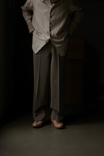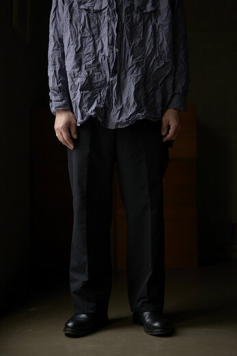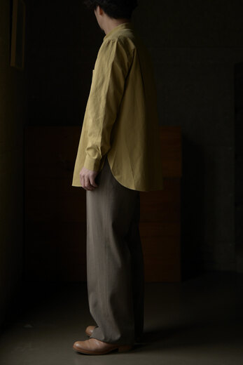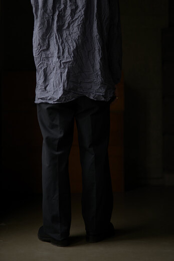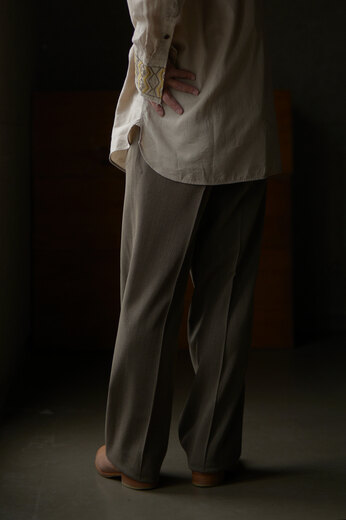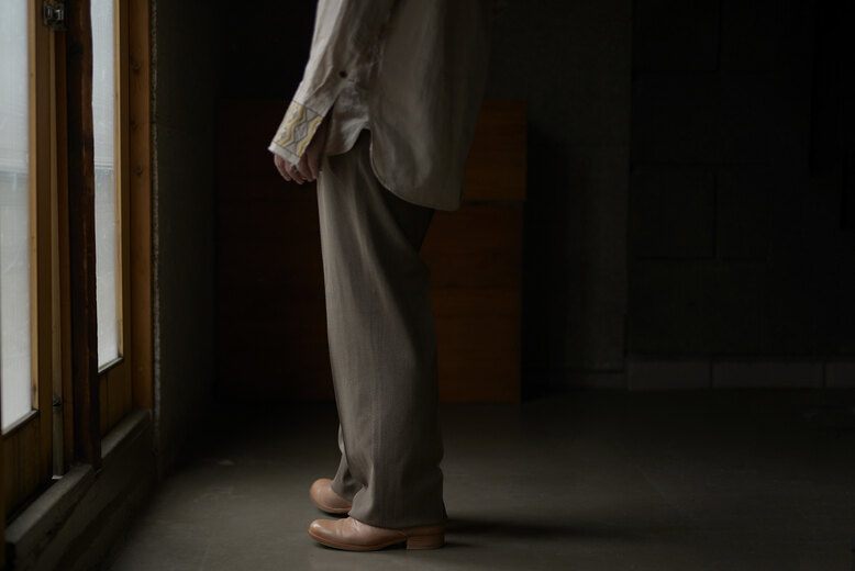 オリジナルで開発した透け感のあるサマーウールのヘリンボーンはヴィンテージのような雰囲気。生地に動きがあり、いつもながらドレープが美しパンツ。サラッとしていて肌触りもよく、風が通り抜けると気持ちが良い。ツータックで少しゆったりのストレート。良い感じに力が抜けているけど、きっちりもしている。どこへでも穿いて行けるのがトラベルパンツ。結局ほぼ毎シーズン買っている気がします。それだけ穿きたくなるパンツなのです。