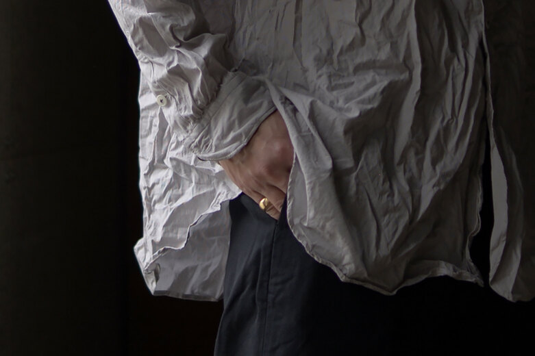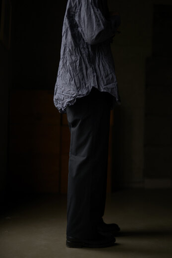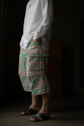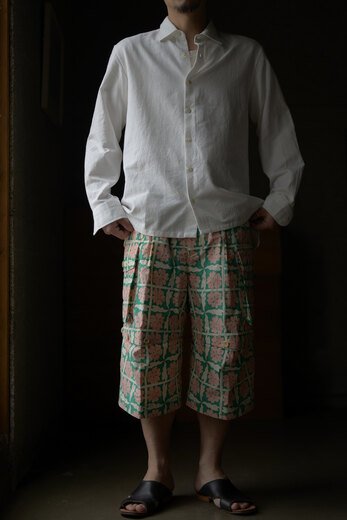 テキスタイルはSMOCK SHIRTと同様にRivotorto Piecesと共に制作し富士吉田の機屋さんで織られたオリジナル生地。パリパリと音のなるペーパーライクな高密度タイプライター。この紙のような質感は無染色の綿だから生まれているそうです。かなり立体的に作られているので、動きやすく、快適な穿き心地。ボタンを1段階外すと膝下が隠れるくらいで、もう1段階外すとショーツに早替わり。その日の気分や気候、洋服や靴によって変化を付けられる、一本のパンツが3役もこなすという面白いパンツ。