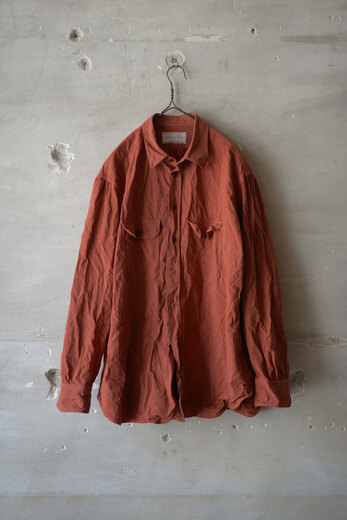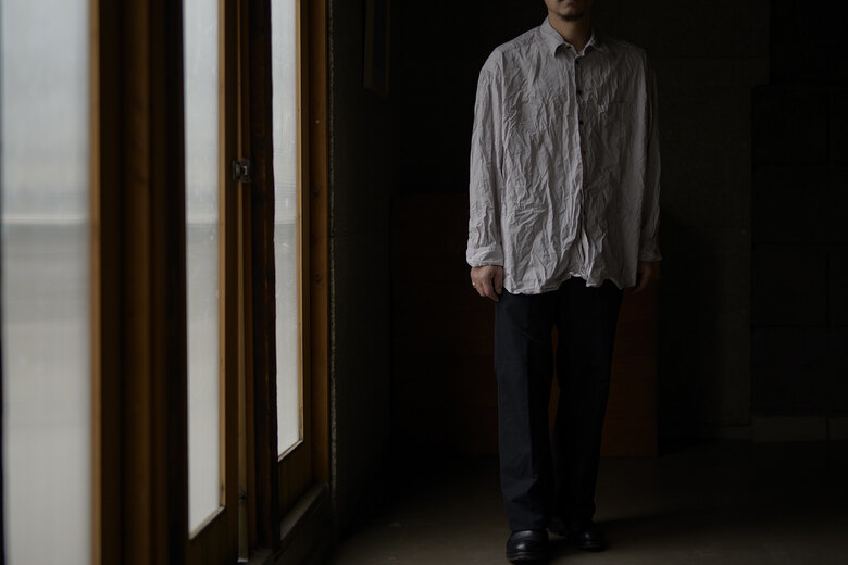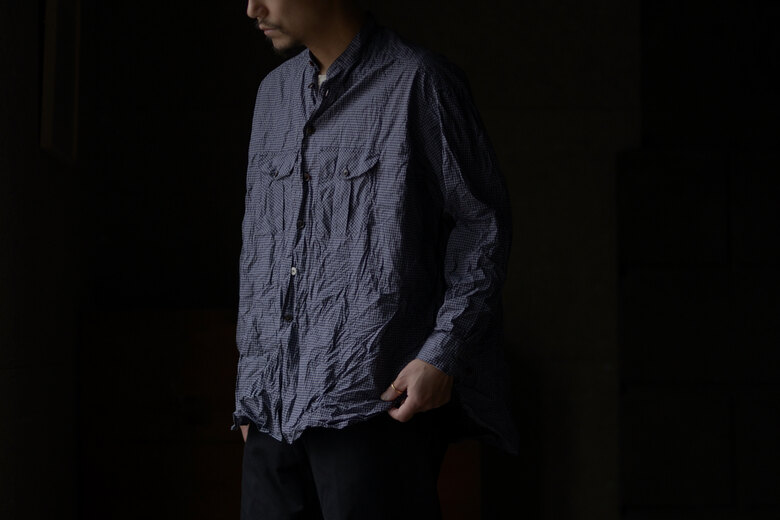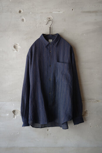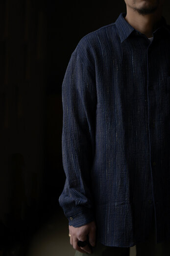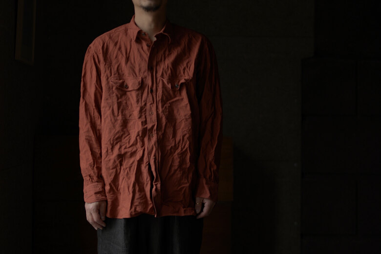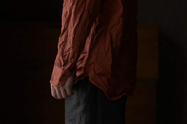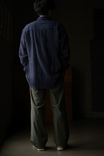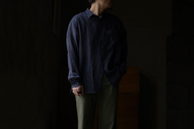 seya.が完璧を求めて作り込んでいる定番のETERNAL SHIRT。綺麗な縫製仕様なのに固すぎない瀬谷さんの作り出す雰囲気がとても好きです。今回はインディゴと柿渋で染色した軽やかなクレープ素材。シャリっとしていて生地の凹凸のおかげで肌への設置面が少なく、暑い時期にも快適に着用できそう。そしてこのシャツは経年変化も楽しめる。インディゴと柿渋がどんな色になっっていくのか。きっと数年後には美しい色へと褐色している事でしょう。