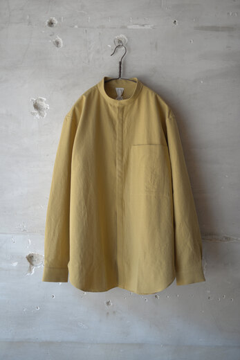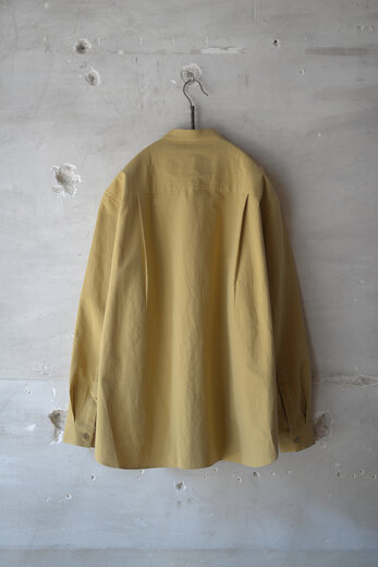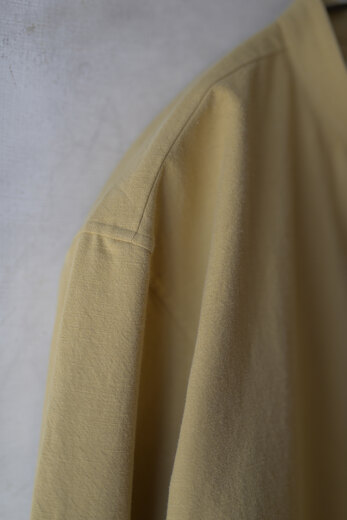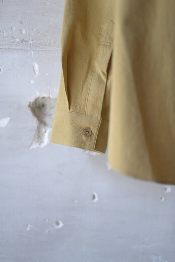 セヤ定番のKURTA SHIRT。今回はネップのあるコットンにザクロの木の皮を使って染色された伝統的な生地。オアシスの砂漠の色のような。天然の染料ならではの優しい色。着ていてとても気持ちが良いです。少し小振りなカフス、背面には広めにとられた2本のタック、裾のラウンドは直線的。細かな運針、襟付けは手縫いとシンプルながらかなり手の込んだ作りのシャツ。襟の形がとても好きで、首元がスッキリと凛として見えるような気がします。