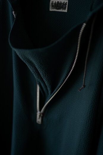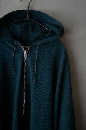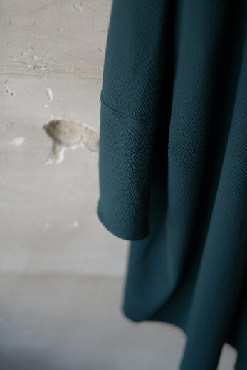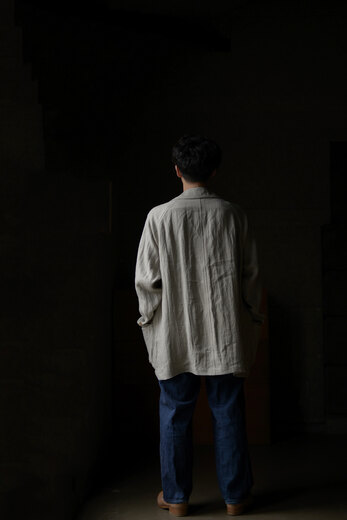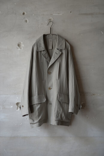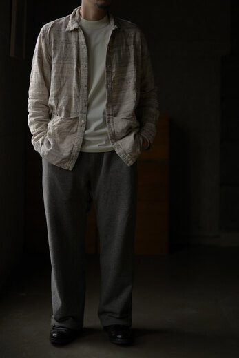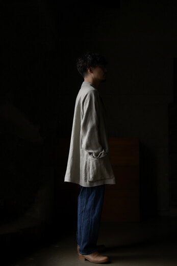 風に靡きそうな軽やかで美しいドレープが一際目に付き引き寄せられ、聞くとドーメルのモヘアシアサッカだった。シアサッカ好きとしてはたまらない触り心地。軽くて伸縮性もあり動きやすく、初夏まで快適に着用できそうです。シャツのようでもありコートのようでもありチュニックみたいな。色んな要素のある、そんな洋服。コンセプトの一つでもある”一つの視点の拘りを排除する。”・・・着る人それぞれに、どんな合わせ方でも見せ方でも考え方でも自由に楽しめる洋服だと感じました。