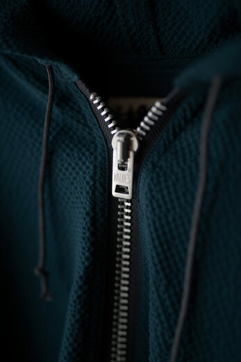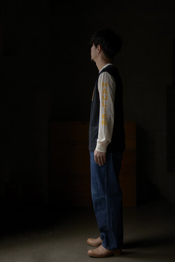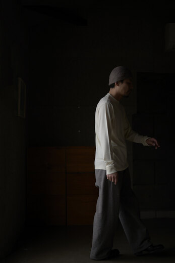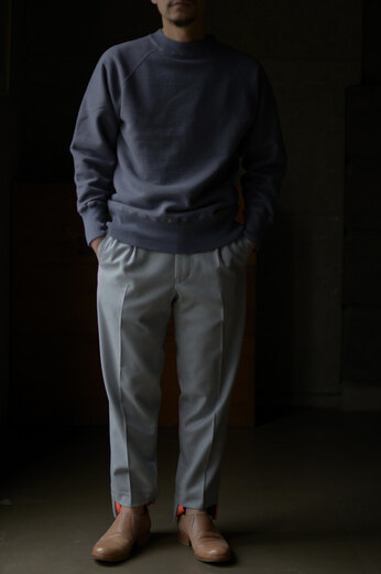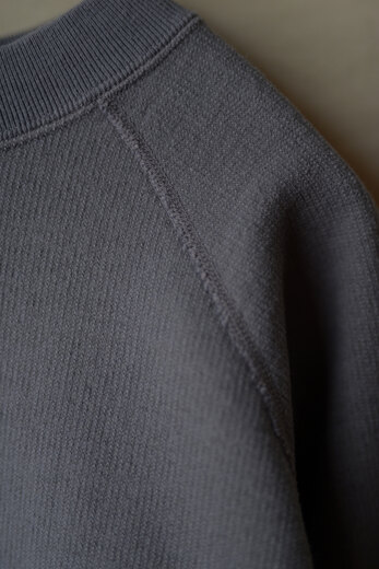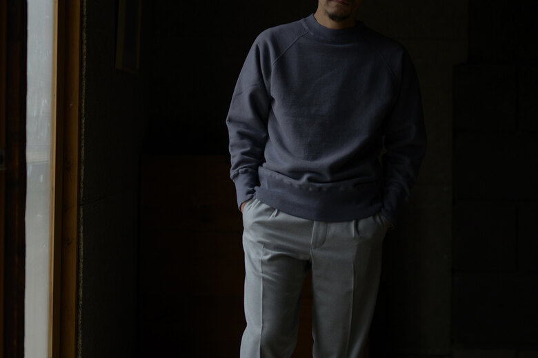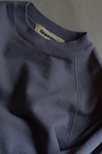 前回のスウェットは硬くて硬くて硬いので着込んで馴染ませていく感じで、今回はヴィンテージのスウェットのようなモチっとした柔らかい着心地。新たにSlopwslowが開発した裏毛のようで裏毛ではないインレイ編みの素材。表の糸はグレーのリサイクルコットンでそこから製品染めをして長年着用して生まれる褐色を再現したカラーも魅力的で、初めからあの着心地を体感出来るのは何だか嬉しくなり選ぶ事にしました。ついつい手に取ってしまう1着になりそうです。