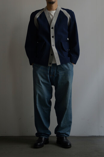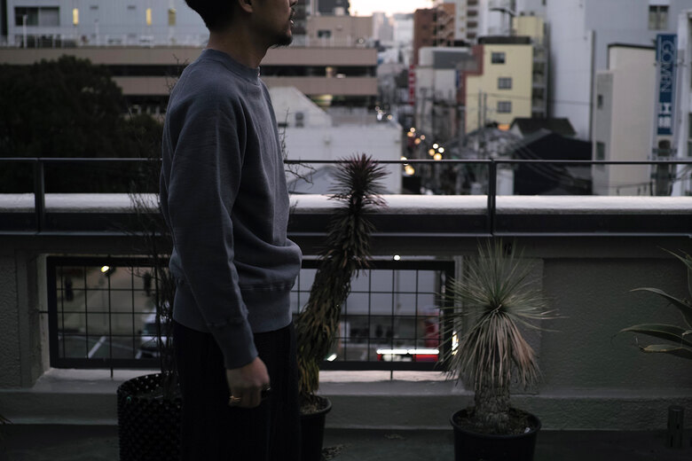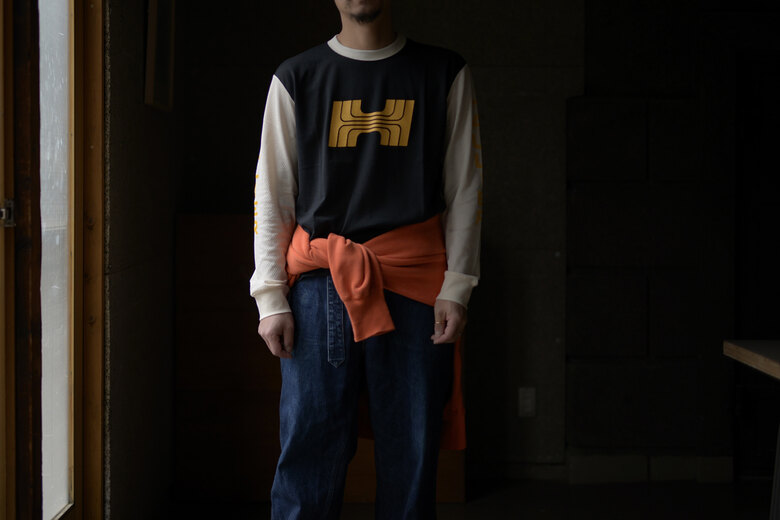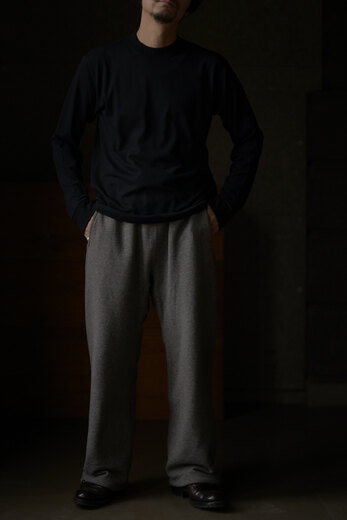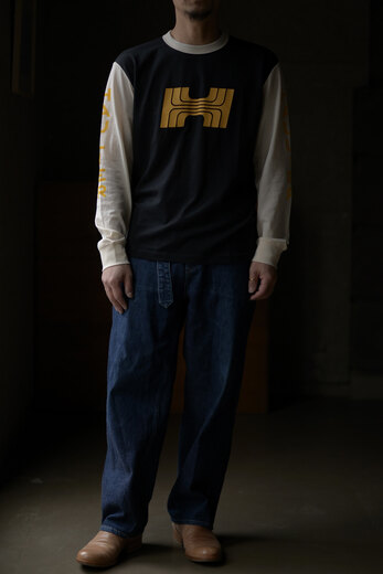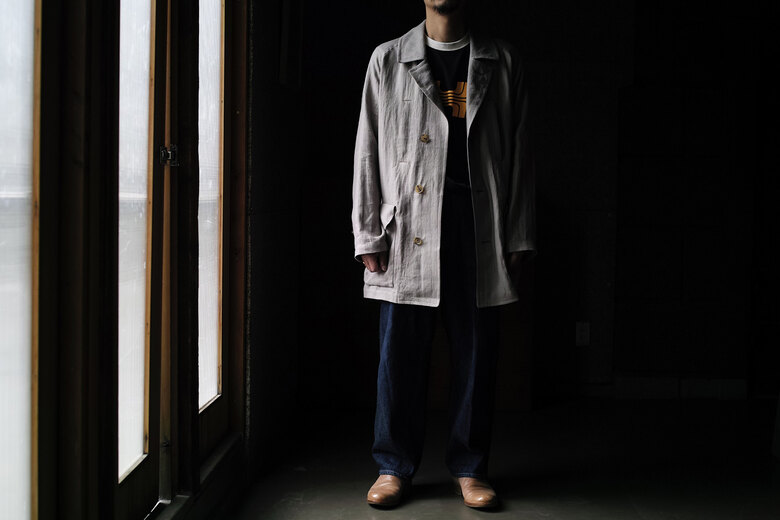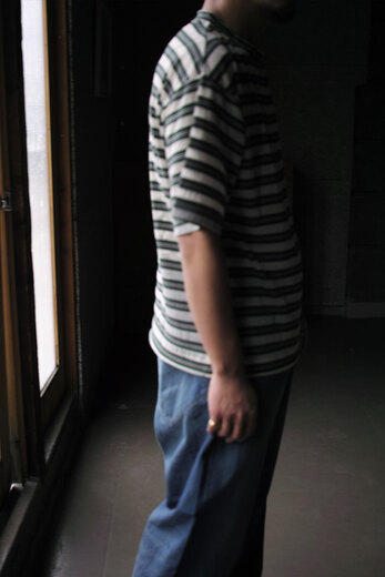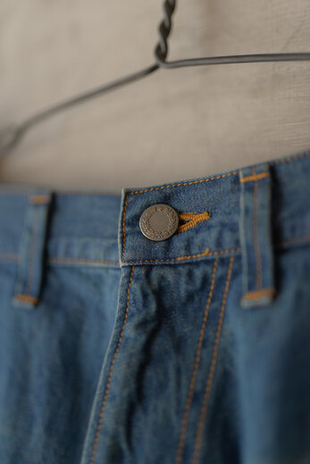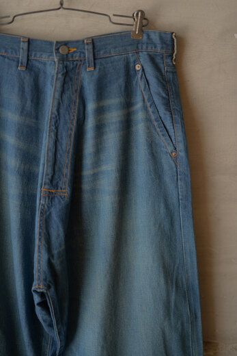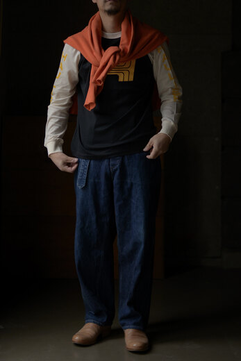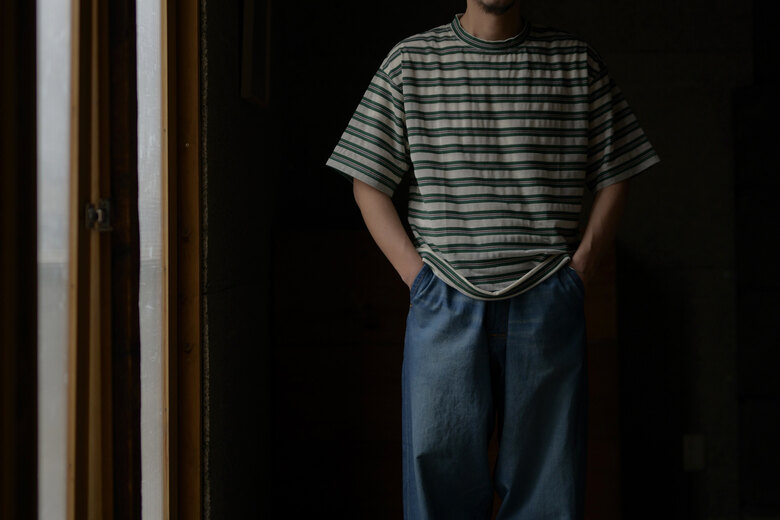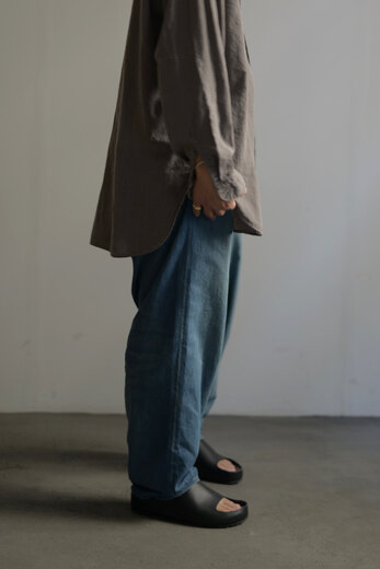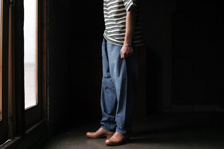 このデニムを見た時、20年近く前にこよなく愛していたデニムと近い雰囲気を感じていた。それはとても懐かしい気分でもあり、あの時の猟奇的とも言えるデニム愛に溢れた時代。その頃の空気を重ねてこのデニムを選びました。それなら、とワンウォッシュではなくこの色を選ぶ選択肢しかありませんでした。少しグレーが入ったような美しいブルー。真夏にも快適なライトオンスのセルヴィッチデニム。股上が深く、少しテーパードしている。何も考えずベルトでギュッと閉めてダルッと穿く。もうそれだけで格好良いのです。
