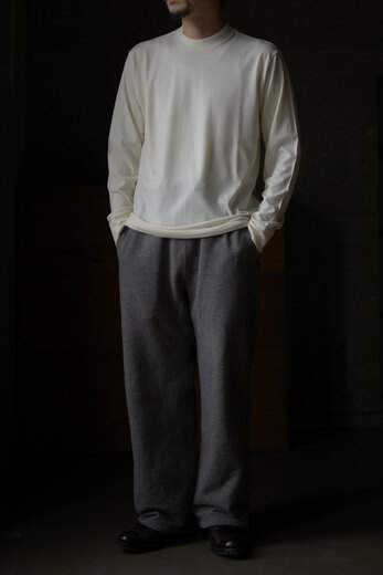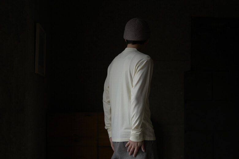 デザイナーの具志堅くんはいつも白いTシャツを着ている。春と秋はカバーオールの下に、夏は1枚で冬はニットの下に。(理由は長くなるのでここでは割愛します。)白いTシャツマスターの具志堅くんが作る白いTシャツとはどんなもんだろうかと、とても興味が湧いたTシャツ・・・のロングバージョンが完成しました。今回は同素材のブラックも入れました。綿紡という綿の糸を作る工程でウールの糸を作り編んだとても手間のかかる素材。上品な光沢、しっかりしているのに柔らかく、素肌にもすごく気持ちが良い。秋と冬はインナーで、春と夏は一枚で。いつでも使えて、心地良くて、楽しめるロンTです。